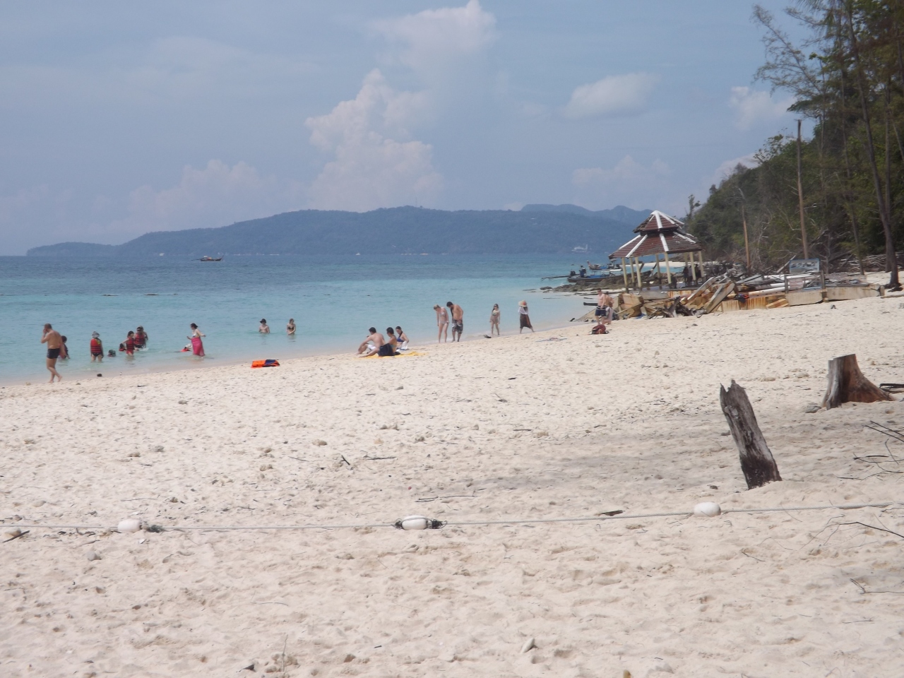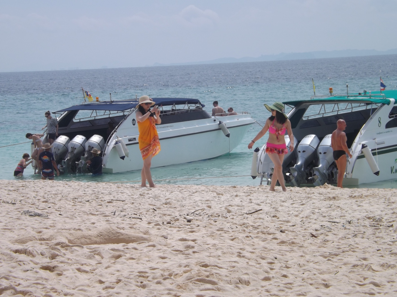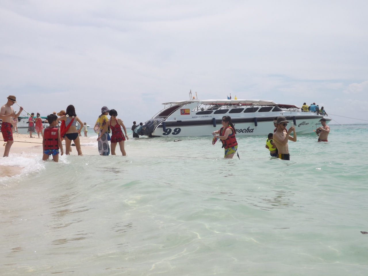 4日目の朝食のあと、ピピ・マヤベイ・バンブー島一日観光です。午前7時45分出発。ボートラグーンマリーナ港よりクルーザーに乗船。最初に上陸したのがバンブー島です。砂浜が真っ白、海の色がすごくきれいです。少し海に入ると魚が見えます。海水浴に来るなら、こんなビーチが理想です。日本でいえば、沖縄のエメラルドビーチのような感じですが、こちらのほうが自然が一杯。また水着は必需品です。