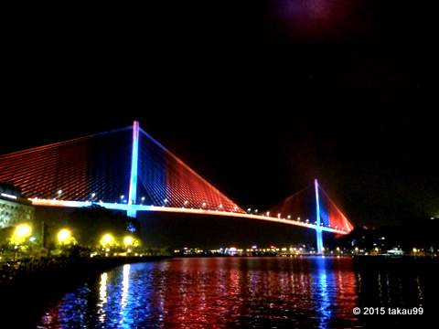 バイチャイとホンガイを結ぶ橋。夜のライトアップがかなり派手で見ごたえがあります。バイチャイ側のライトアップの見える海岸沿いには簡易カフェが建ち並びます。ブオンダオ通り付近からだと2km程距離があります。
