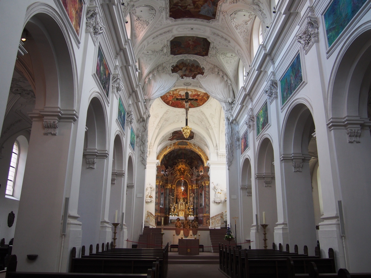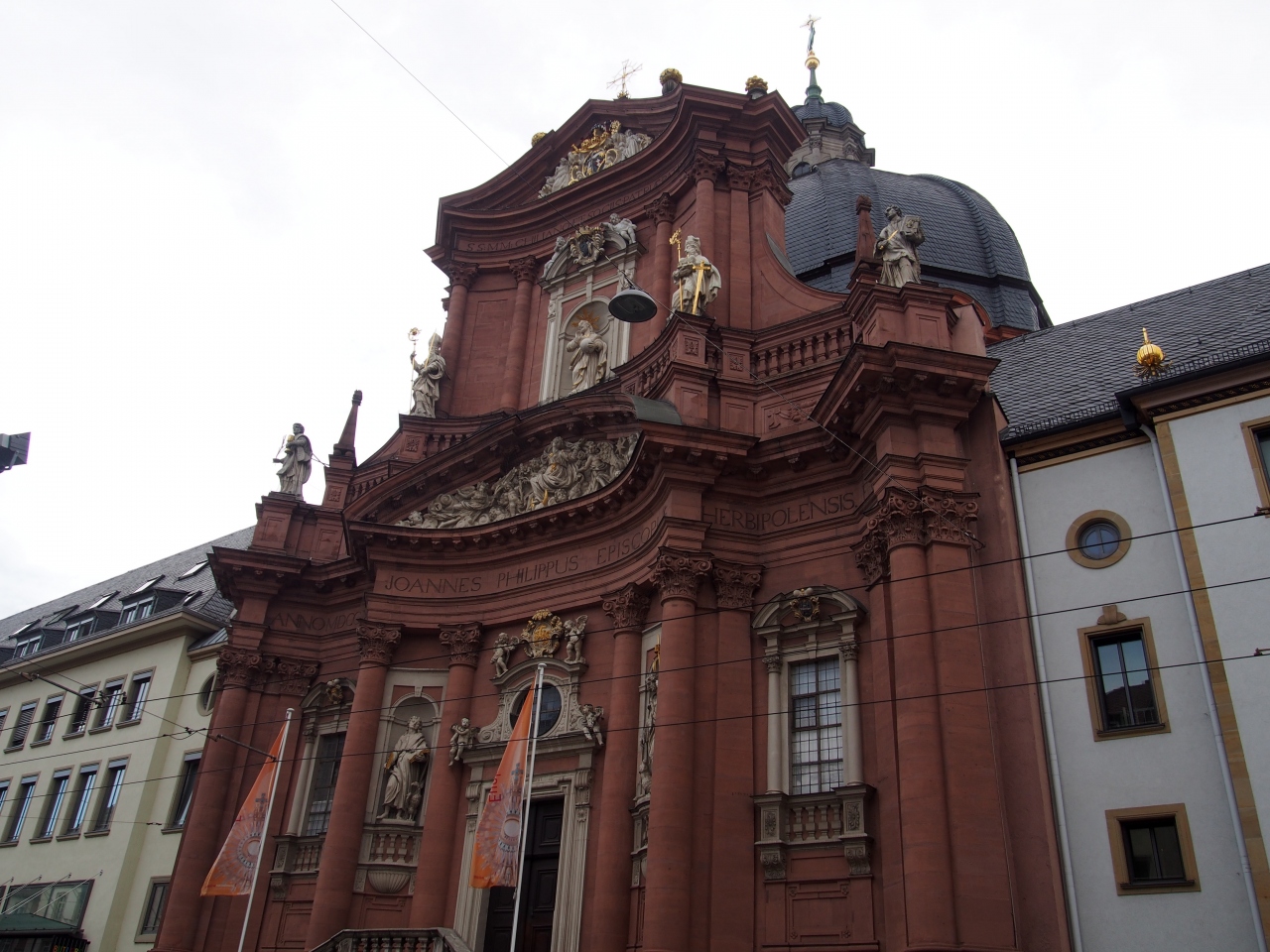 ヴュルツブルクの街中、オフィスやお店の並びに赤い建物の教会があります。教会の中に入ると一転白を基調とした美しい作りで、天井の絵と装飾も見ごたえがありました。
