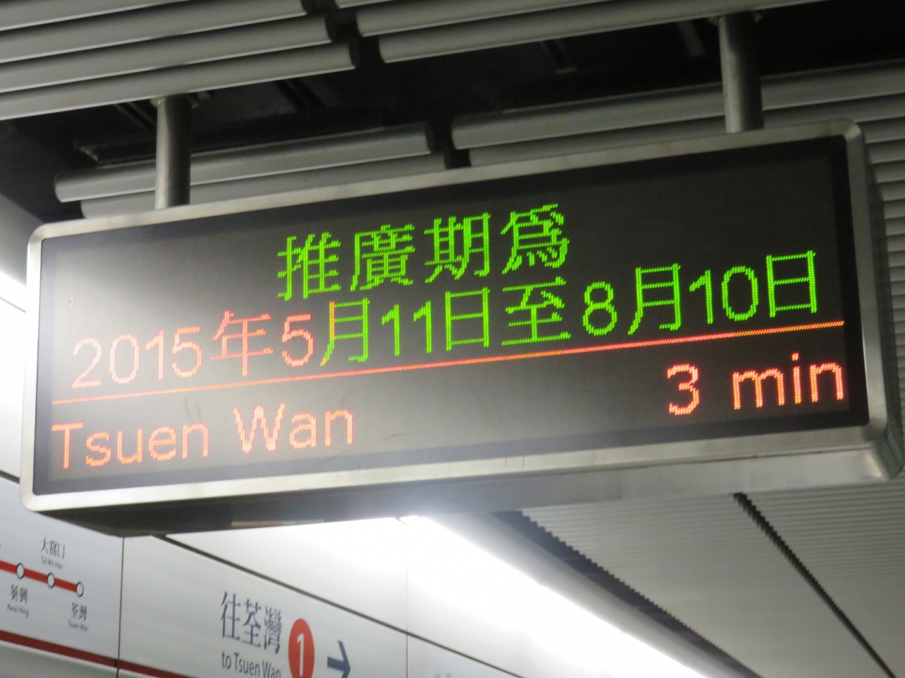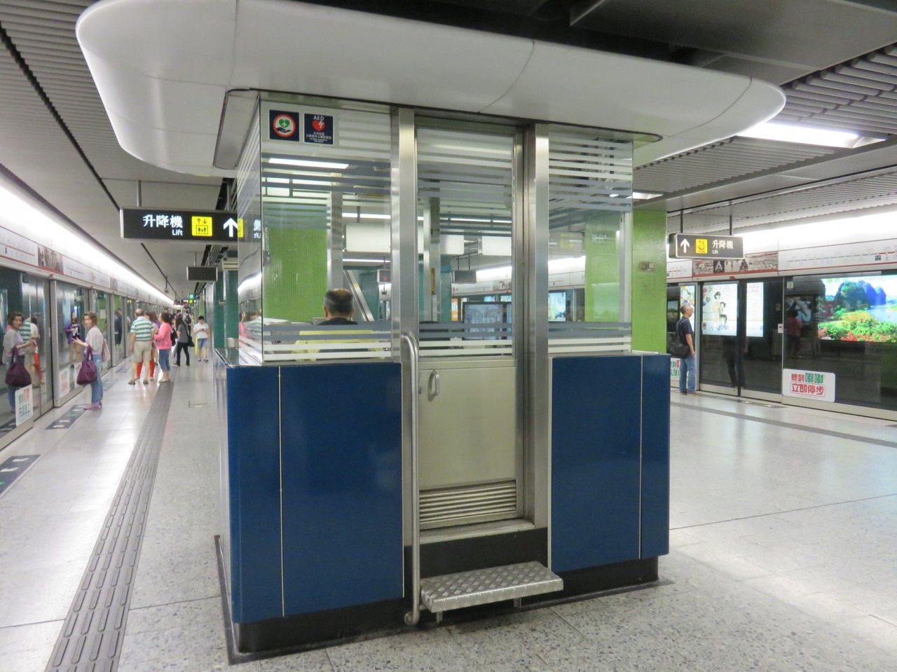 此方の駅は2線1面の島型ホームになります。香港のMRTは次の列車までの時間を示してくれるので時計を見る必要がありません。ホームと線路は仕切られており、列車の扉の位置にガラス戸が有り、これならホーム転落や接触事故は皆無だと思います。欠点は「撮鉄」ができないことぐらいでしょうか。