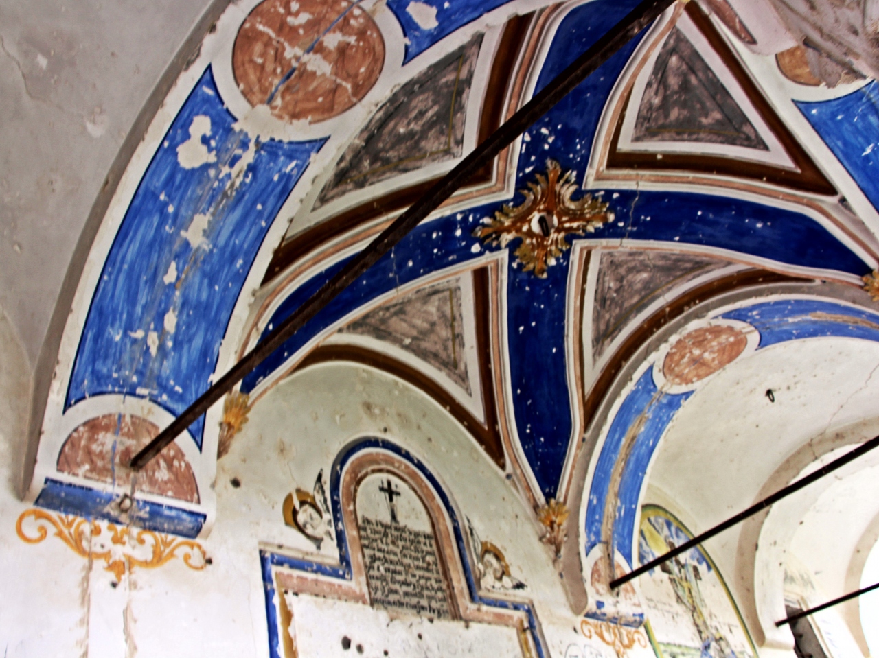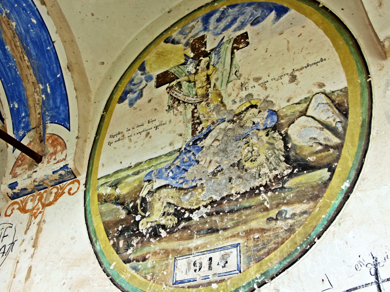 現在は教会には鍵がかけられ中には入れませんが、格子窓や鍵穴から教会の中を覗くと、そこには美しいフレスコ画が残っていました。