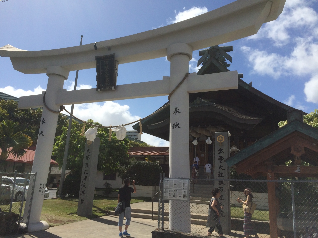 「モヤモヤさまぁ~ず」でおなじみのハワイ出雲大社です。この日は残念ながらヌシカンさんは居ませんでしたがアシカンさんがいました。お守りやTシャツなどお土産物がいっぱいあります。今や立派な観光スポットとなっているようでトロリーバスも目の前で停まってくれます。