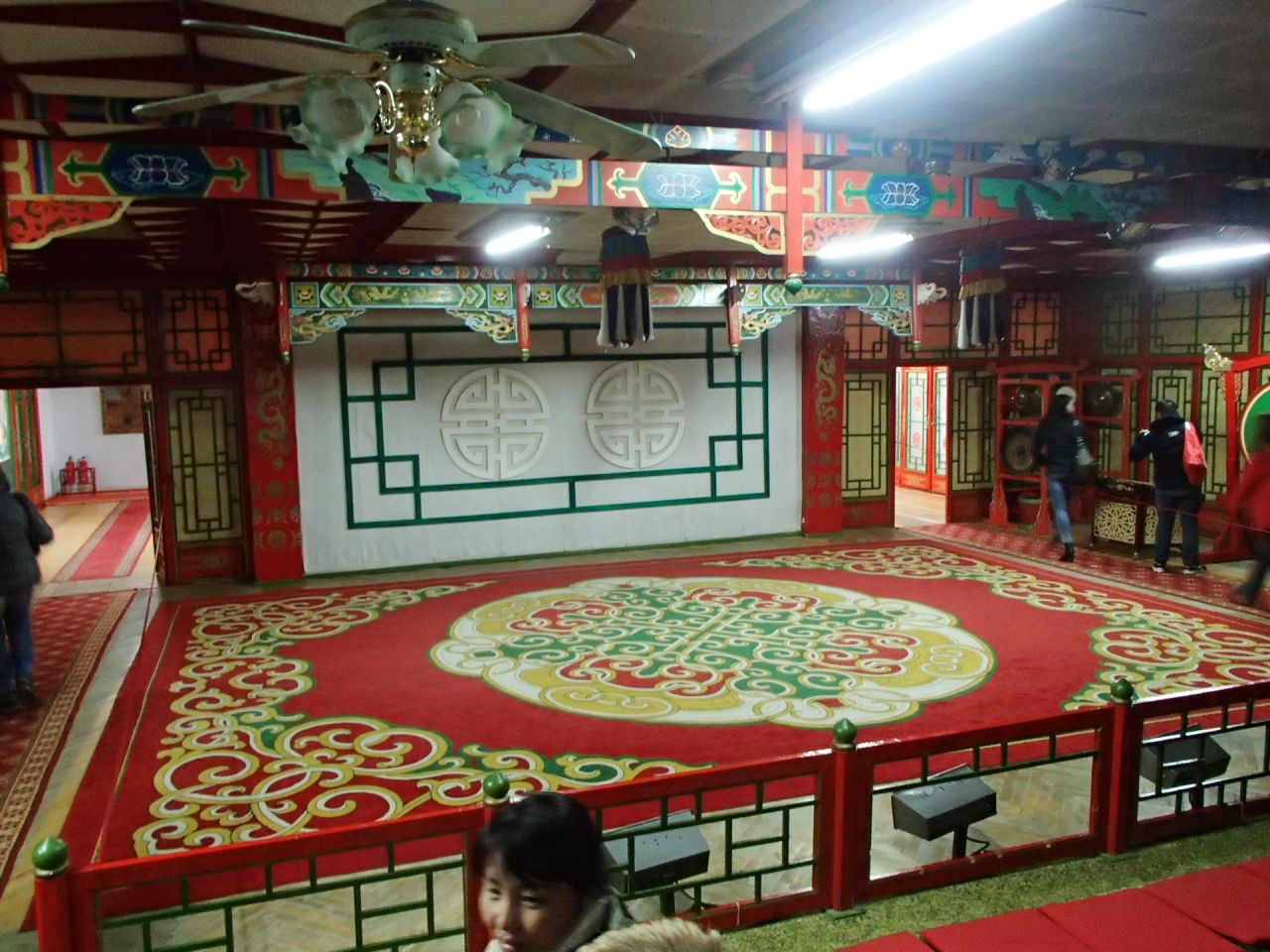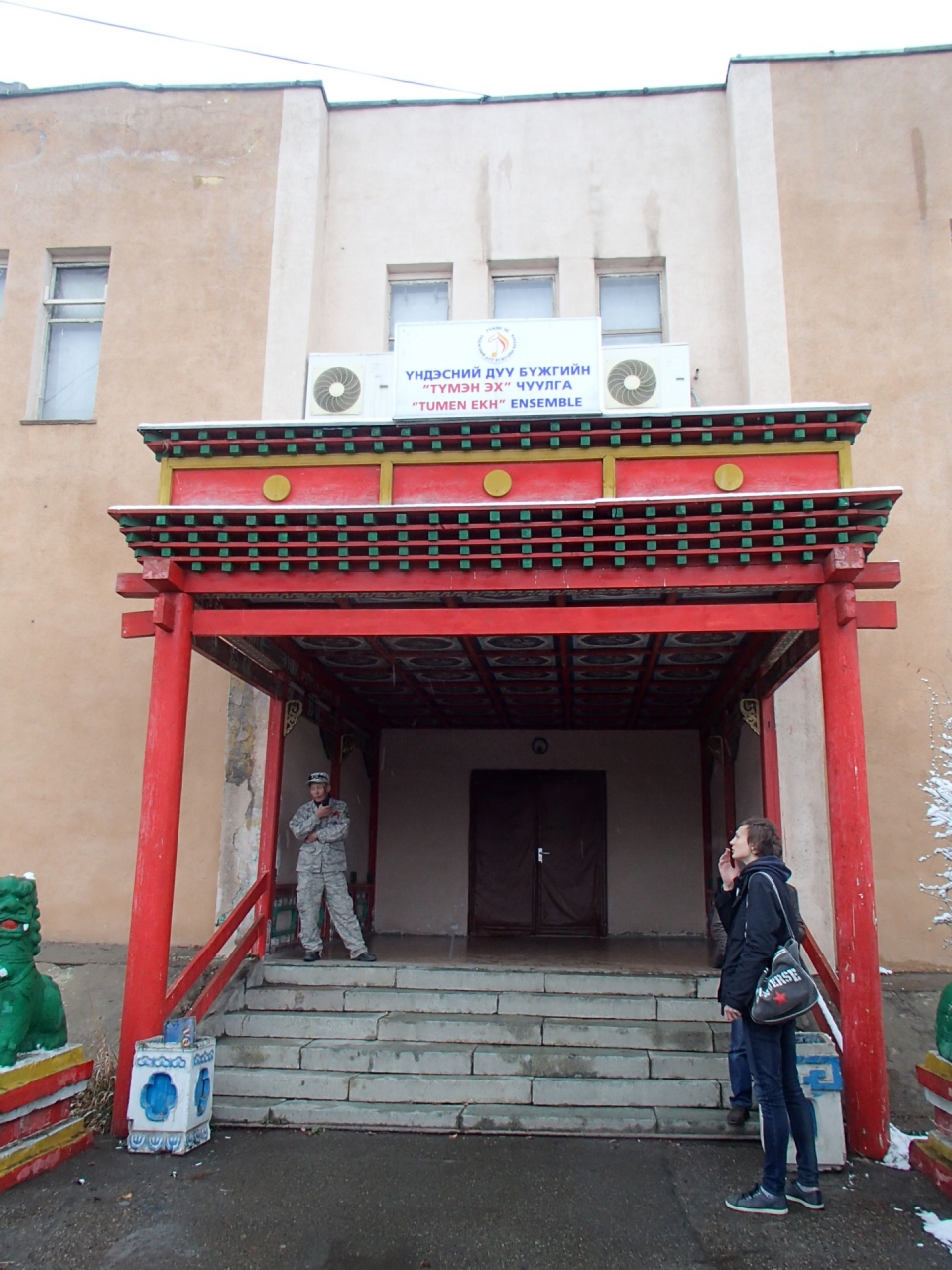劇場はナイラムダル公園の南にある。スフバートル広場南のチンギス大通りを南下して劇場が見えたら、公園の外壁づたいに脇道を歩けば、公園内に入れるゲートがある。。20,000Tg。写真撮影と録画は別料金。当日は会場にはざっと30人〜40人の観客がいた。