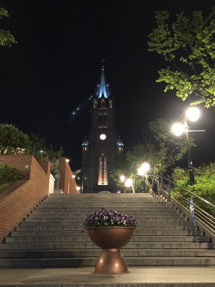 明洞の街は東のほうへ緩やかな上り坂となっておりまして、その丘の上にそびえる大聖堂でございます。