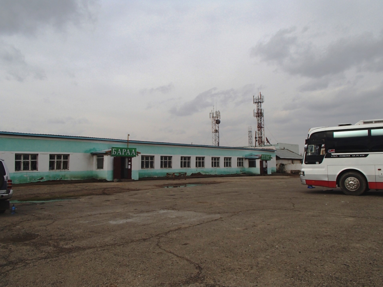 路線バスで登録されてしまったが、ウランバートルとを結ぶ長距離バスの発着所。2014年4月末日に利用したとき、位置が『歩き方』の地図とは異なっていた。町の西、川を渡る手前、ATM・郵便局・トラクターモニュメント・警察の裏側付近だった。小さな市場も兼ねており、裏の建物で衣類や食料品を売っている。ULNからのバス到着後、18時になる前に閉まっていた。水1.5リットルを700Tgで購入。