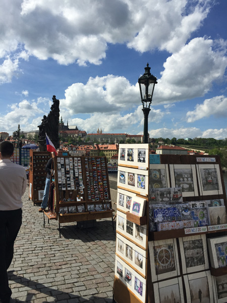 ただの橋のようで色々と楽しむことができます。橋には露店が出ていたり、バンドが演奏していたりします。橋の欄干には15体ずつ、合計30体の彫刻が並んでいて、そのいくつかのプレートを触ると願いが叶うとか…。