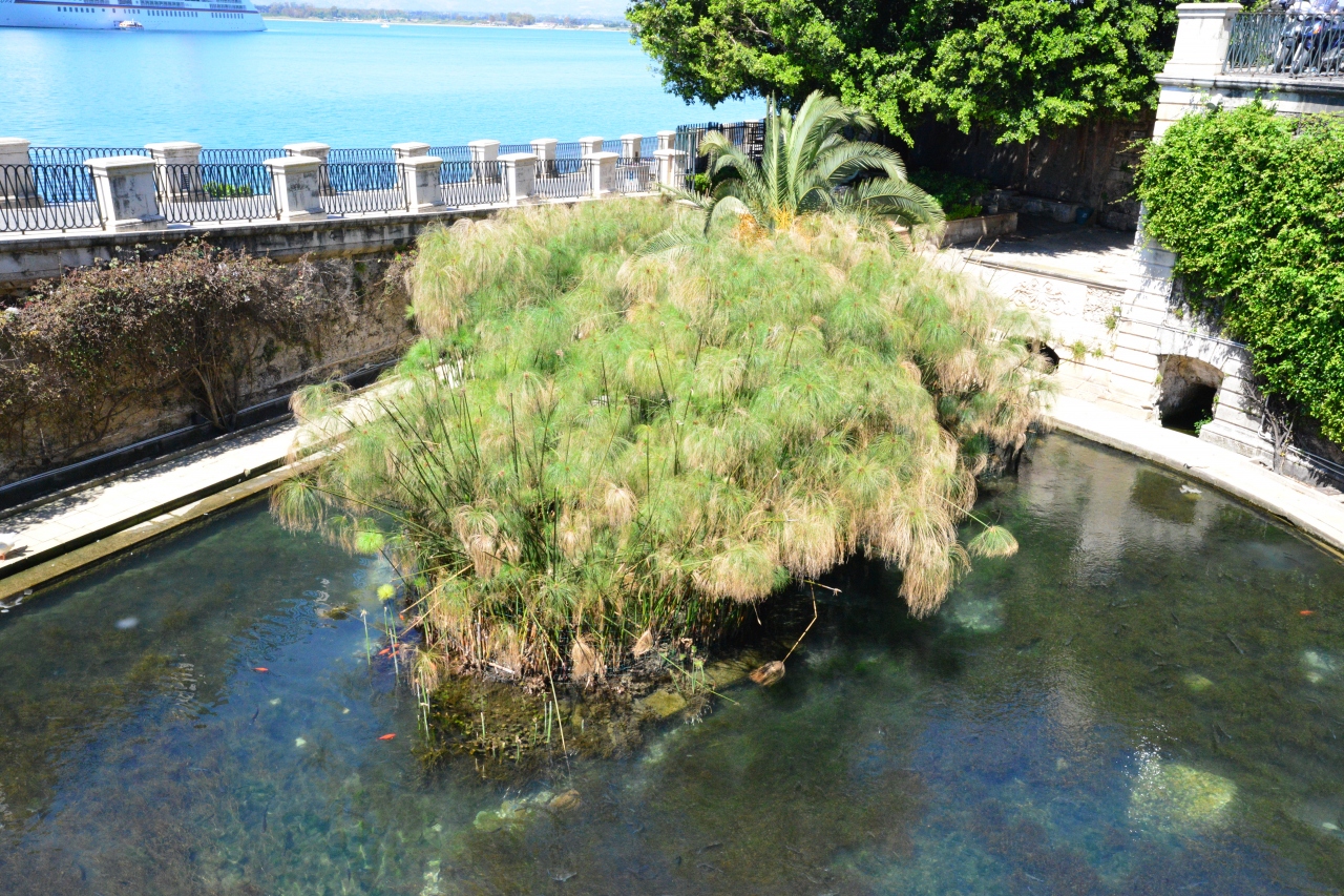 パピルスが茂り、赤い鯉の泳ぐこの泉は海の間近にありながら、昔から、真水が湧く不思議な泉で、川の神から逃れようとした妖精アレトゥーザが泉になったという伝説を持ちます。周辺にはカフェなども多く、遊歩道もあって美しい海の景色を満喫できます。