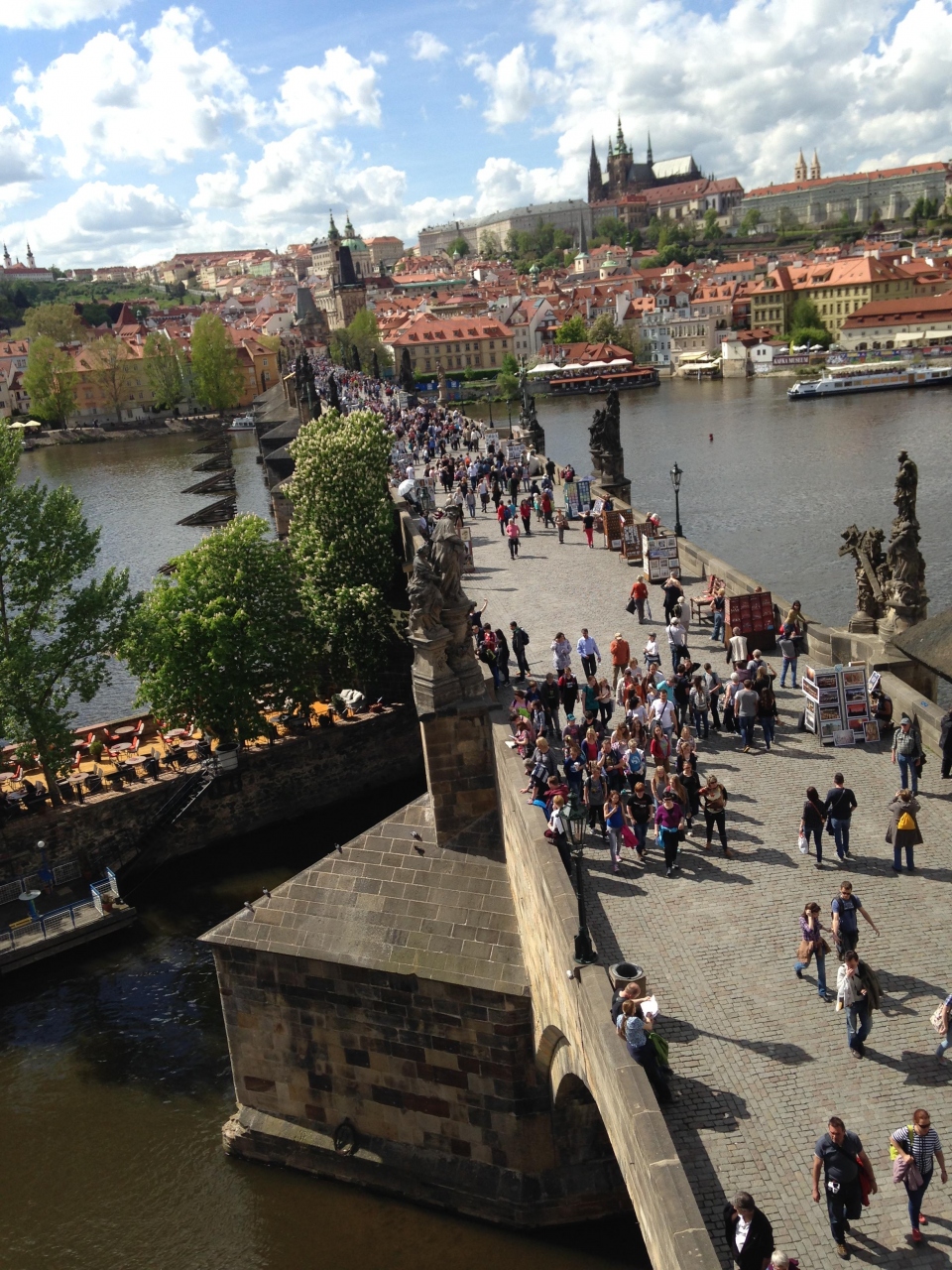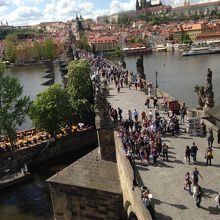 狭いらせん階段をくるくると、ずっと登って行ったらチケットオフィスでした。カウンター前や階段の途中で十分にガイドブックでよく見るカレル橋を通る人の光景が見えます。外観もいいけれど橋の絶景ポイントなのでお勧めです。