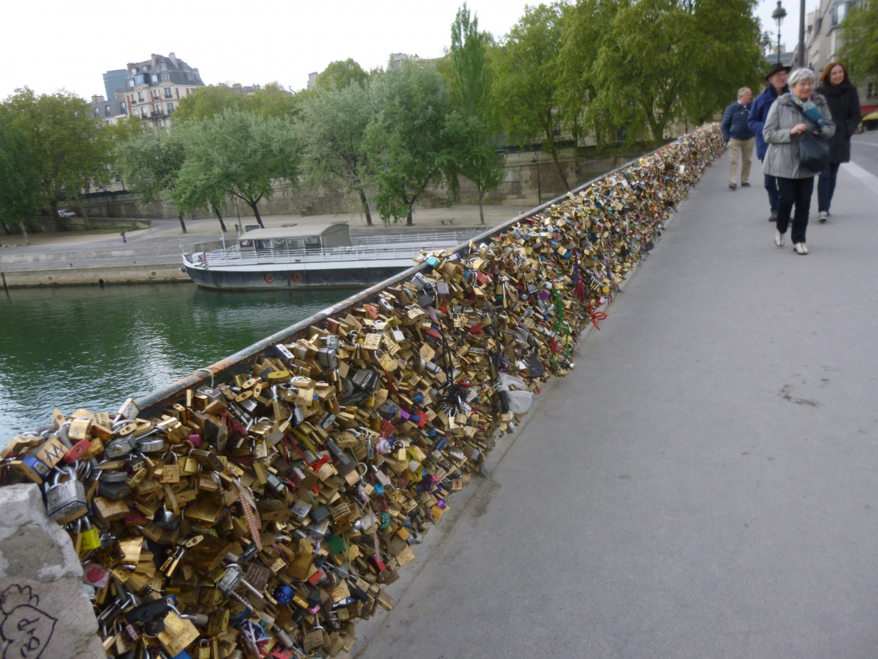 セーヌ川には、”愛の南京錠”が架かる橋がいくつもあり、右岸から左岸に行き来する観光スポットになっていたのですが、世界中から訪れる恋人達の南京錠があまりにも重くなり、その重みで橋が壊れるのが多くなり、禁止になると今日のニュースで報道されていました。まぁ、残念!