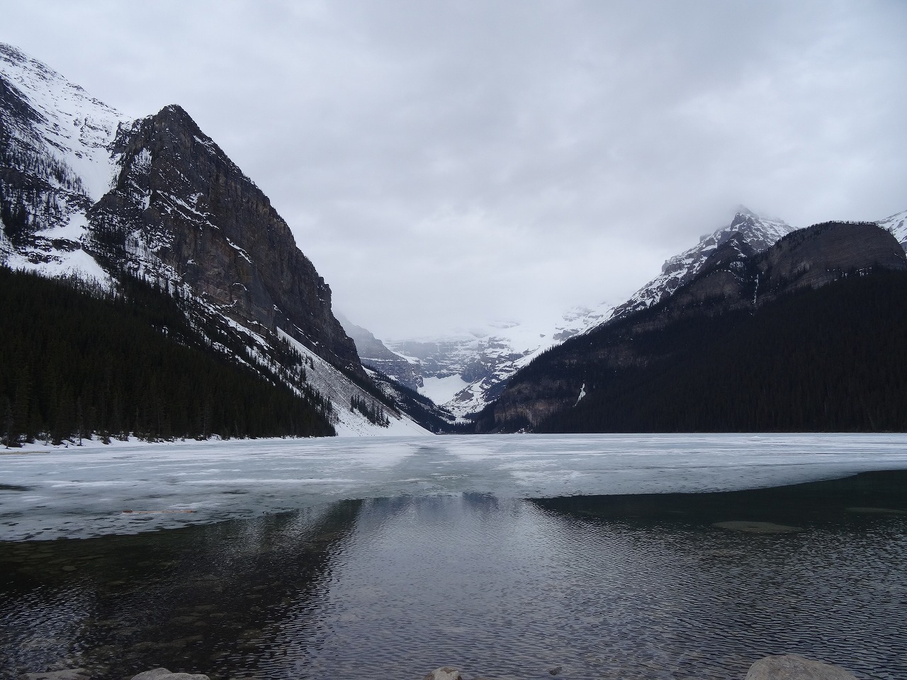 ★「レイクルイーズ Lake Louise」5月半ばに訪れました。ちょうど薄氷が8割がた表面を覆い、後ろの雪山ともあいまって、すばらしい景観でした。しかもお天気は最高!きらきらと光る輝きは、何時間でも見ていたい気分でした。でも、水の冷たさはすごいです。