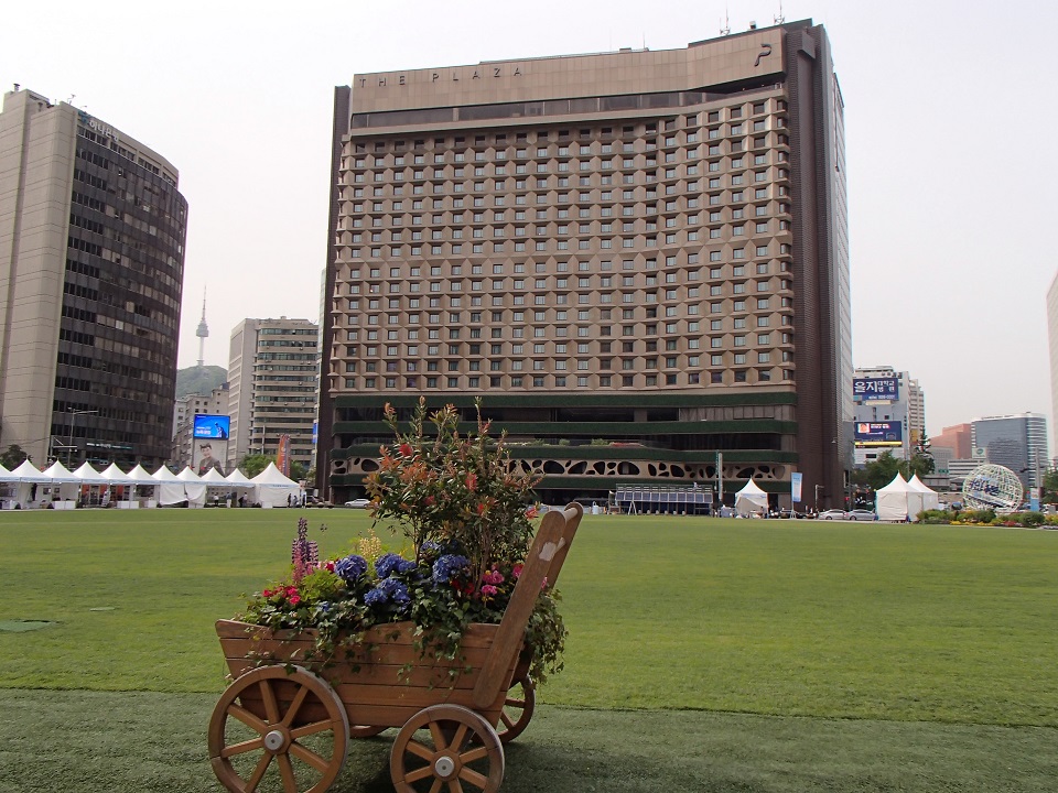 旧ソウル市庁舎とプラザホテル前の芝生広場で、イベントなどがおこなわれることもあるようでございますが、平日は閑散としておりました。