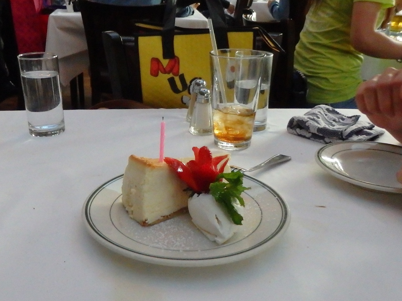 しばらくすると、近くにいたウェイターさんたちが集合してハッピーバースデーを歌いながら、ローソクを立てたチーズケーキを持ったウェイターさん登場。