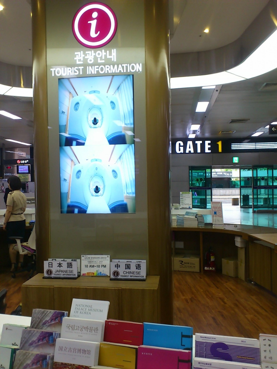 金浦空港の2階の到着階と1階の2カ所にあります。2階の方が大きいですが、人が多いので1階の観光案内所を利用しました。英語・中国語・日本語の各種パンフレットやソウルの地図などが置いてあり、ここでかなりの資料を入手出来たので、その後のソウル観光に大変便利でした。