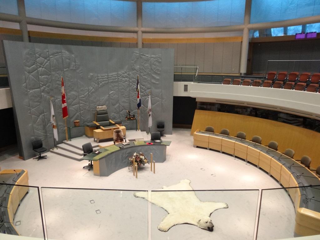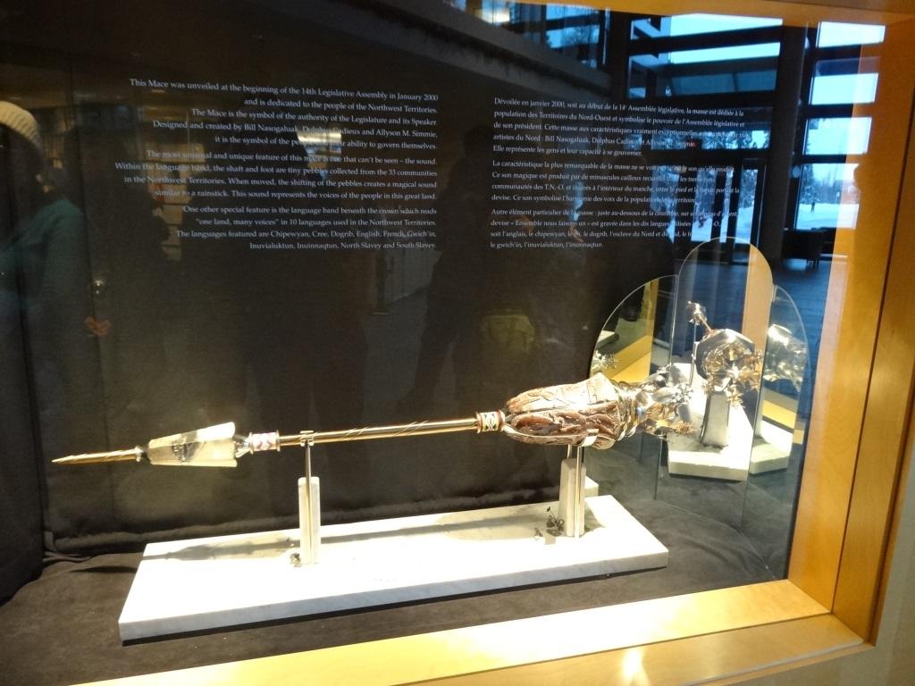 ツアーに付いていたイエローナイフ市街観光にて訪れました。州の議会を行う議事堂で、円形の議事テーブルの真ん中にあるシロクマの毛皮がシンボリックでした。議事堂の外には原住民の文化や伝統工芸が飾ってあります。