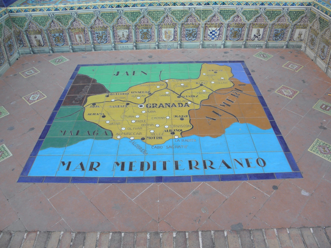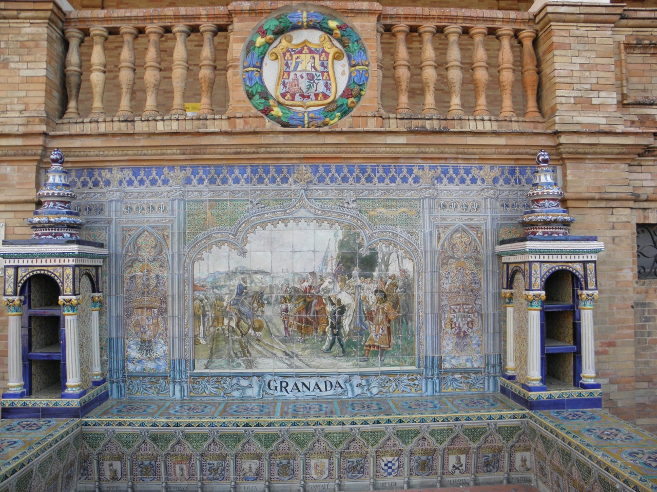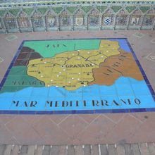 この広場は建物の側面を飾っているタイル画が見物です。スペイン各地のいろいろな出来事をタイル画と地図(これもタイル)で表してます。1つ1つ丁寧に見ているといくら時間があっても足りません。