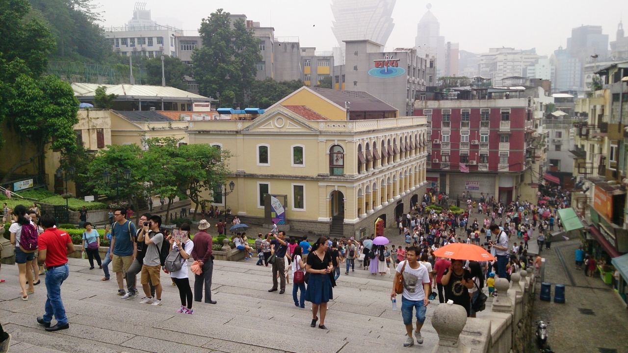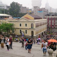 マカオのナンバーワン観光スポットである聖ポール天主堂跡地をバックに写真を撮るのに最も最適な場所で昼夜を問わず、観光客だらけで深夜と早朝以外は他人を映り込ませないでの写真撮影は不可能なぐらいの人出なので、本当にいい写真を撮りたければ早朝ぐらいしかチャンスはないと思います。マカオの歴史地区は建物が建て混んでおり、開けた場所がほとんどなので、この広場は貴重な空間ですし、聖ポール天主堂に向かって幅の広い階段があるので、その広さはさらに強く感じます。