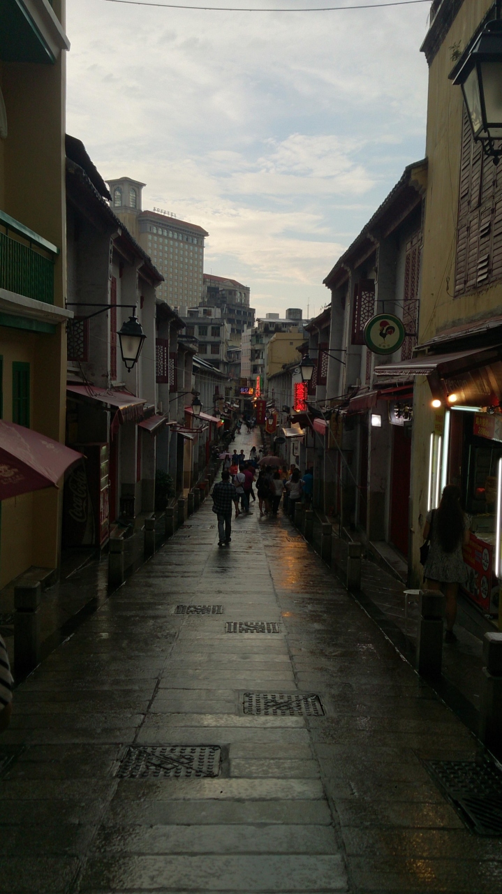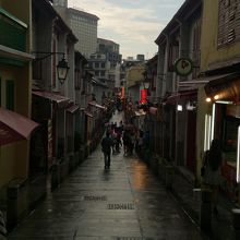 長屋風に建物が軒を連ね、その建物は朱色に塗られた窓枠や窓、戸がはめ込まれており、マカオ半島南部の歴史地区内ではここだけしか見れない、趣のある風景が広がっています。旧ポルトガル領の南ヨーロッパの雰囲気は全くなく、中国様式の建物と外装であり、マカオが欧州と中国の文化と生活が交錯している場所であることを強く感じさせるところです。有名観光スポットなんでしょうが、ここの通り自体は、観光客向けの飲食店・物販店はチラホラで、多数は地元向けに商売をしている物販店、企業の事務所、住宅なんかもあって、騒々しい雰囲気は全くなく、非常に落ち着いた環境です。
