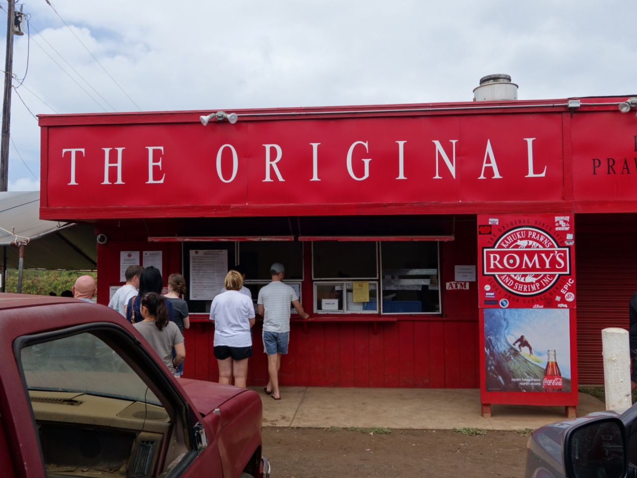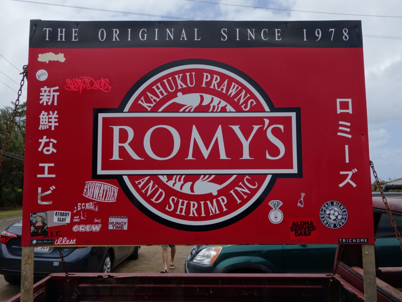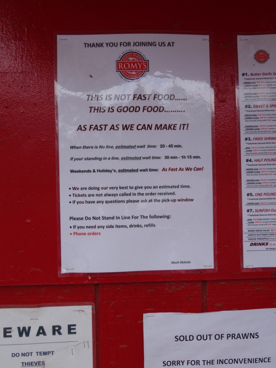ロミーズはハレイワからもちょっと距離があるし、レンタカーの人じゃないと先ず行かないと思いますが自分はココのガーリックシュリンプ大好きです。エビもですがガーリックとソースのしみ込んだご飯が美味い! 注文のレジの横にファーストフードではなくてグッドフード、待ち時間の目安など書かれていますが、美味いけど本当に空いているときでも30分は待つ感じです、なので待つのが我慢出来ない人にはオススメ出来ない。