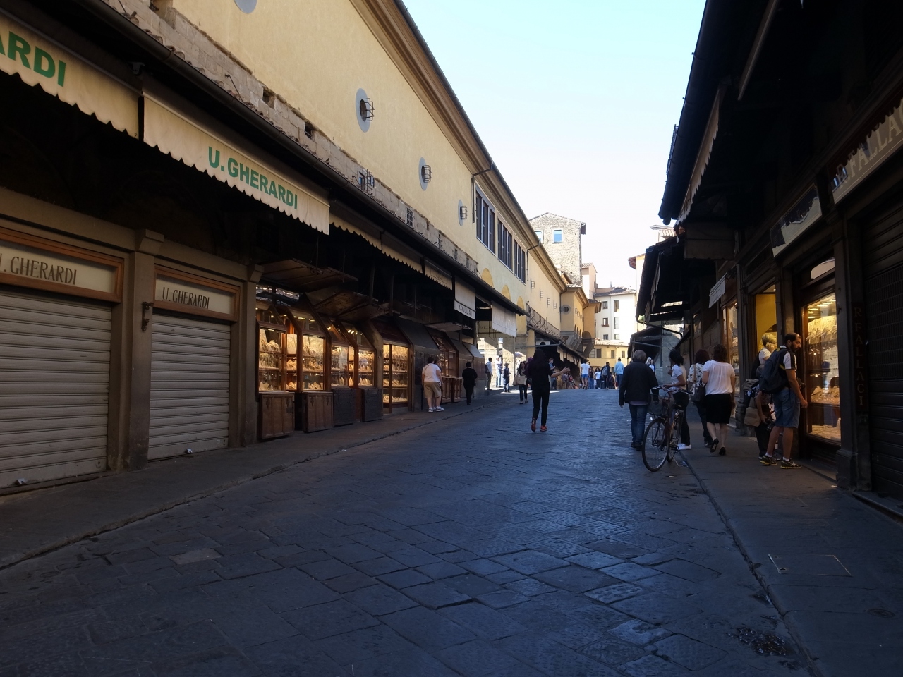 ヴェッキオ宮殿とならんで有名な橋。橋げたの上に長屋?みたいな店舗が軒を連ねています。宝石店や金細工のお店が多いようです。フィレンツェで最古の橋とのこと。ベネツィアのリアルト橋に雰囲気が似ていなくもないかな。