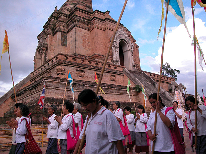 2003年と2005年と、2回見ています。折れた尖塔を抱く巨大なパゴタです。もともとは86メートルと、ビル並みの高さがあったとか。塔の下の部屋には仏像が安置されています。四方を守る象も印象的。夜は派手派手しくイルミネーションされるあたりもタイらしい?