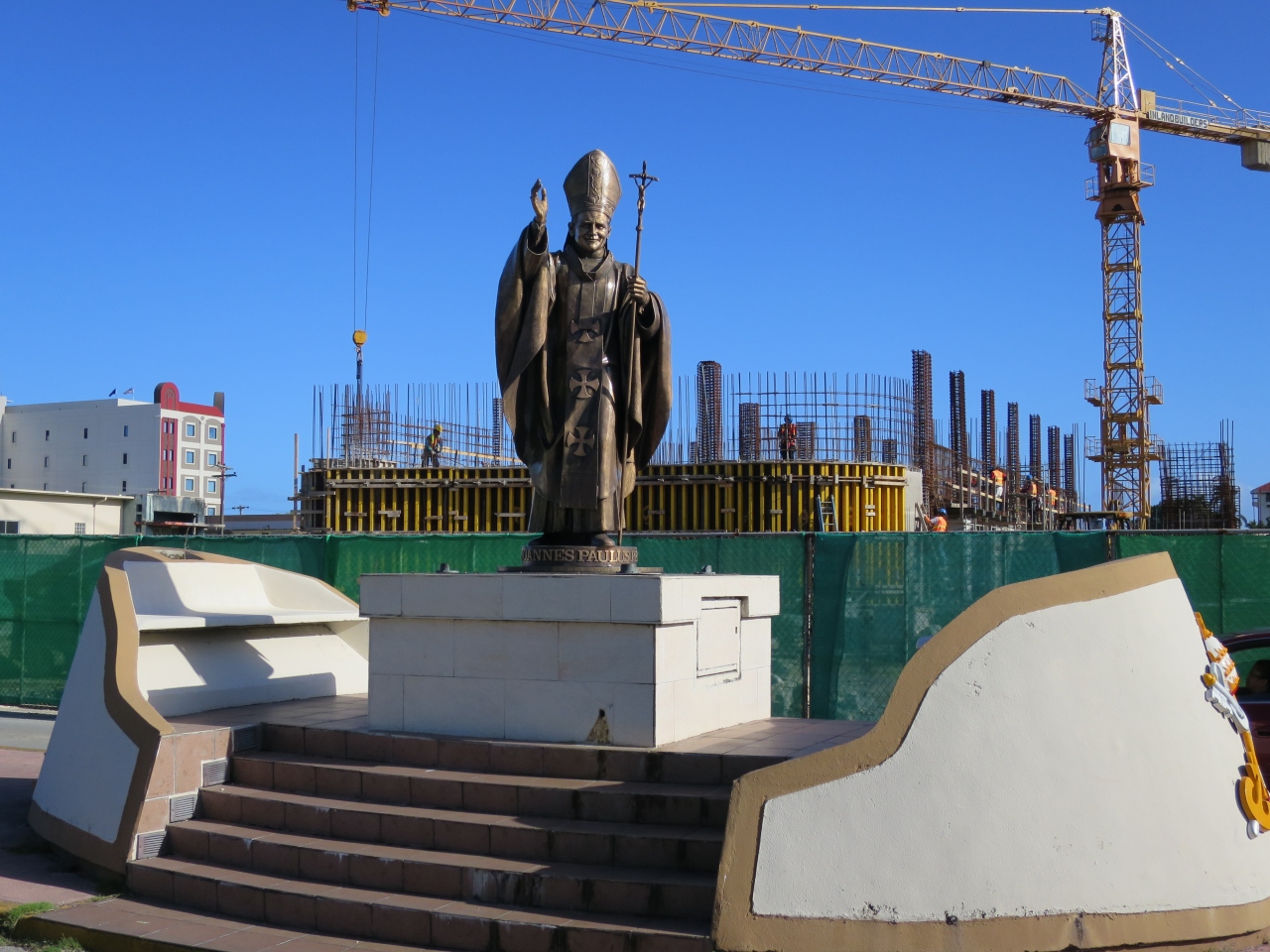 グアム ハガニアのスペイン広場の北側の道路に大聖堂を向いてヨハネ パウロ2世教皇像が建立されています。なんと、この像は道路の真ん中の中央分離帯の様な所にあります。何故このような場所に設置されているかは知りませんが、車で行ったときに見入ってしまって、つい左側を通ってしまいました(あわてて右に戻りましたが)。