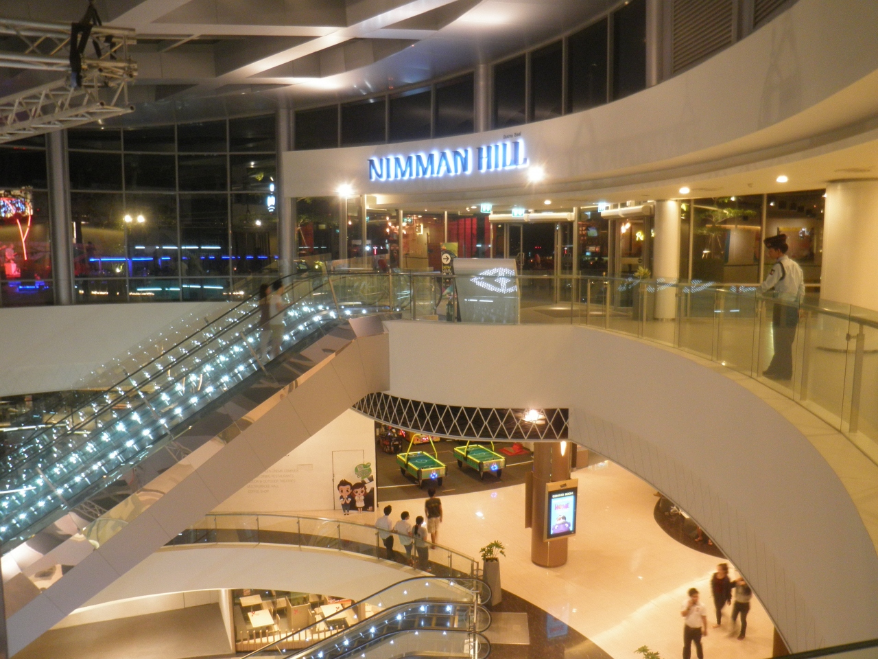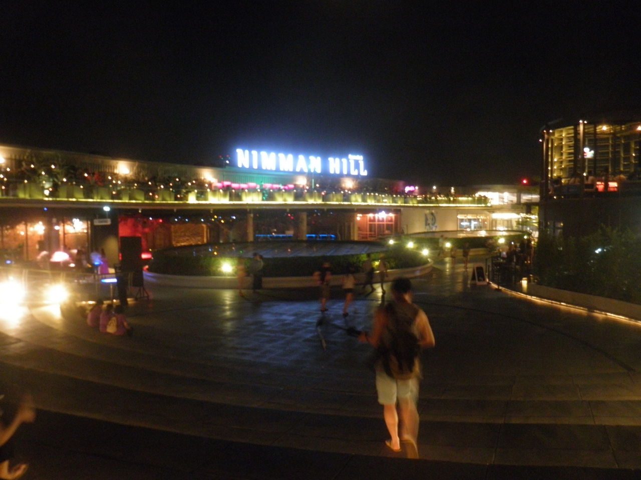 マヤ ライフスタイル ショッピングセンター 屋上は、NIMMAN HILLというレストランやバーなどが立ち並び、夜はとてもにぎやかです。 何組かの生バンドが演奏していたり、夜景を楽しむことができました。 ただ、昼間は立ち入り禁止のようで、エレベータをおりると警備員がとんできました。