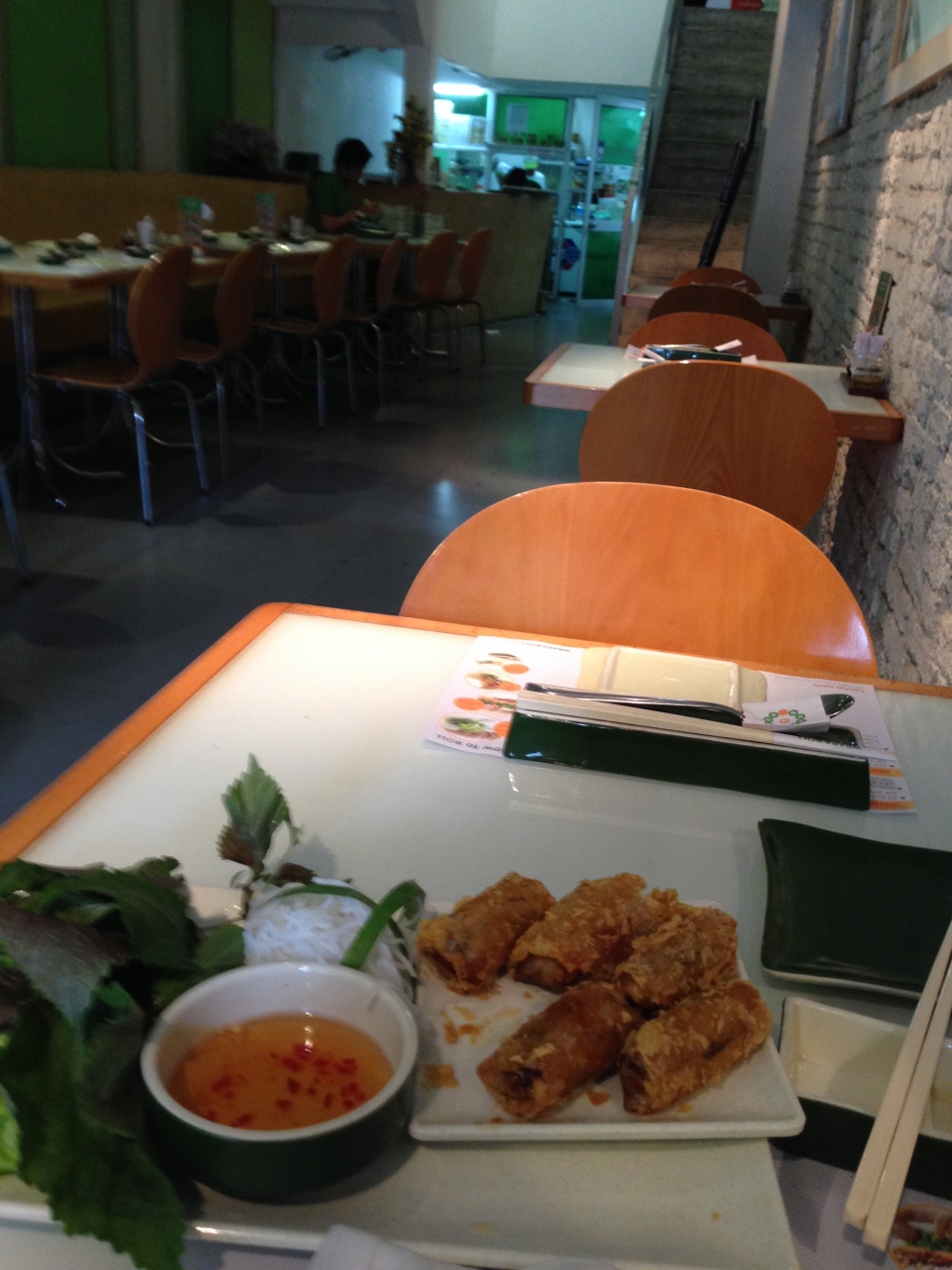 遅めのランチで利用しました。15時くらいに行ったところ、お客は1組のみでした揚げ春巻きとバインセオを注文。春巻きはできたてであつあつでした。バインセオは、中の野菜が生っぽかったです。1品あたり約70000ドンくらいでした。+10%の税金がかかります。料金的には安くはないと思います。一人ではなく、数人で行ってシェアするとちょうどよいと思います。