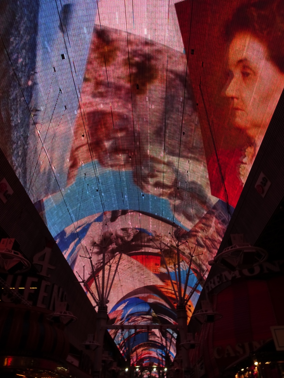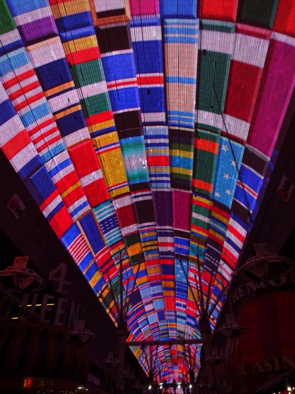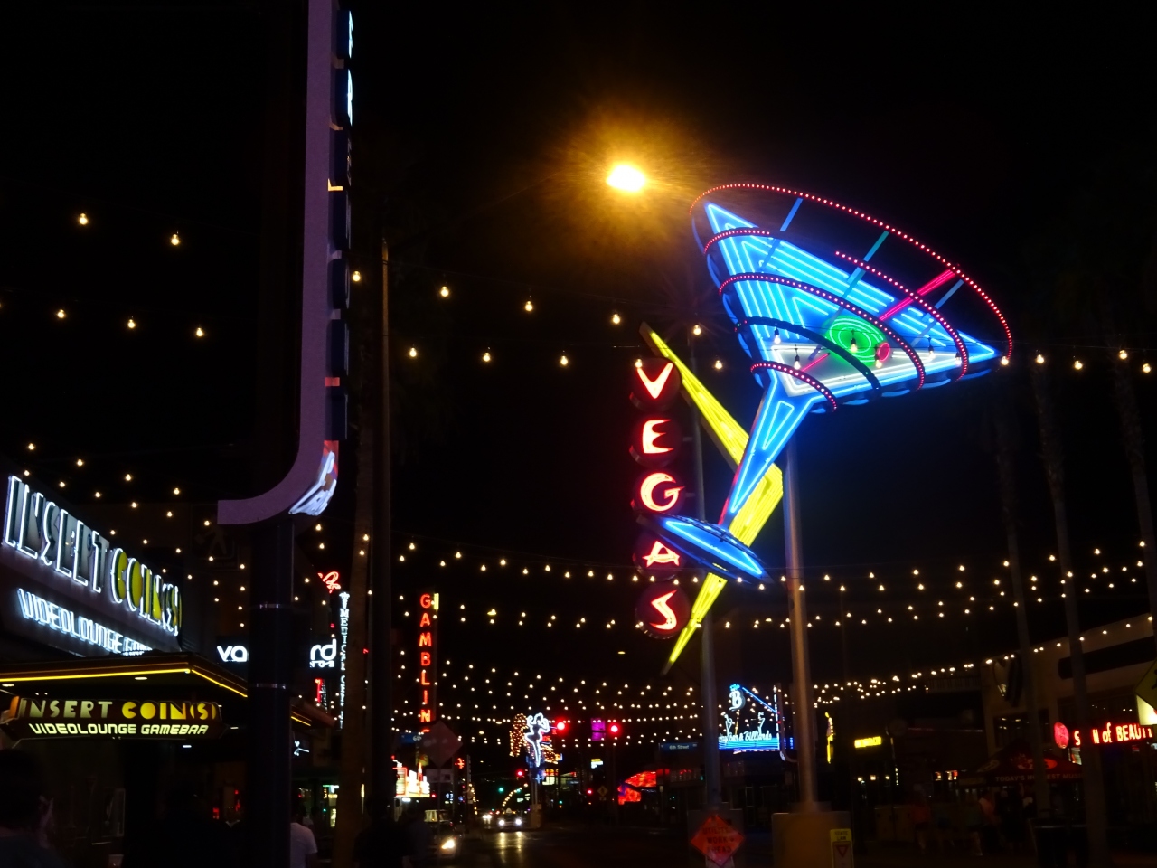 そこそこ派手ですが、わざわざ見に行く必要がないような感じです。ガイドブックなどではかなりお勧めの場所として紹介されていますが、ダウンタウンまではバスに乗っても結構時間がかかるし、アーケードでの光のショー意外見所はありません。ショーも10分程度と短い為、時間を掛けてわざわざ行くくらいなら、ストリップのホテルの無料のショーでも見た方が良かったと後悔しています。