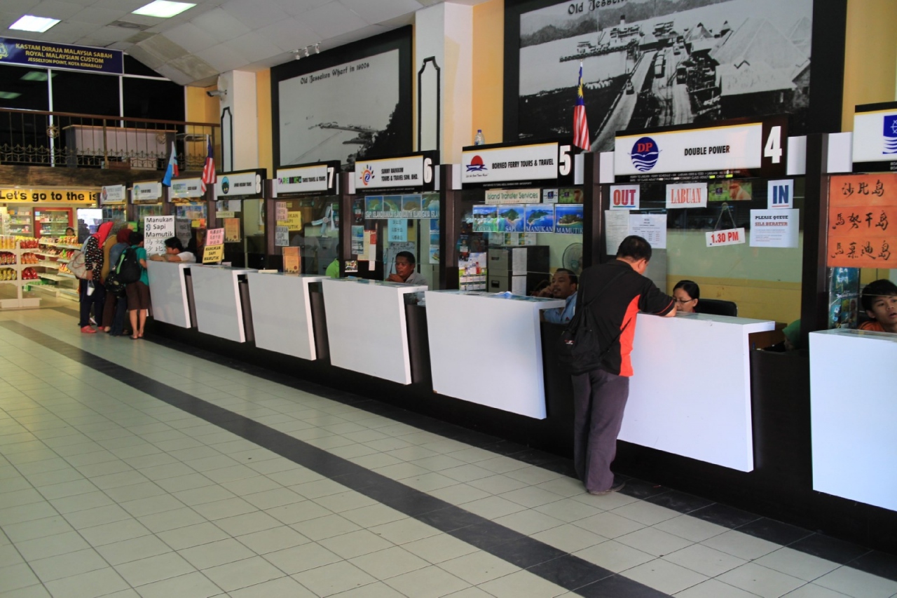 サピ島にツアーでなく個別にボートのチケットを買って行きました。Jesselton Point にカウンターがいくつか並んでいて行き先や時間でカウンターが決まっているようで教えてくれます。8:50にカウンターに行って、9:00のボートに間に合いました。飲食店もいろいろありパンも売っているのでランチを持っていく必要がある場合はここでも買えます。