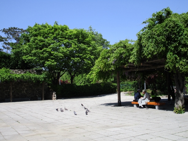 きれいな藤棚があり、お昼ご飯を食べてくつろいでいる人たちがいました。