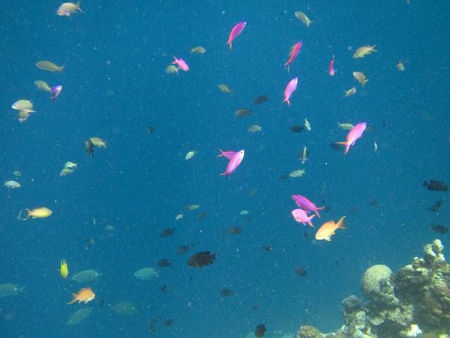 浅瀬のサンゴに群がる色取り取りのカラフルな小魚が群れ踊る様は、