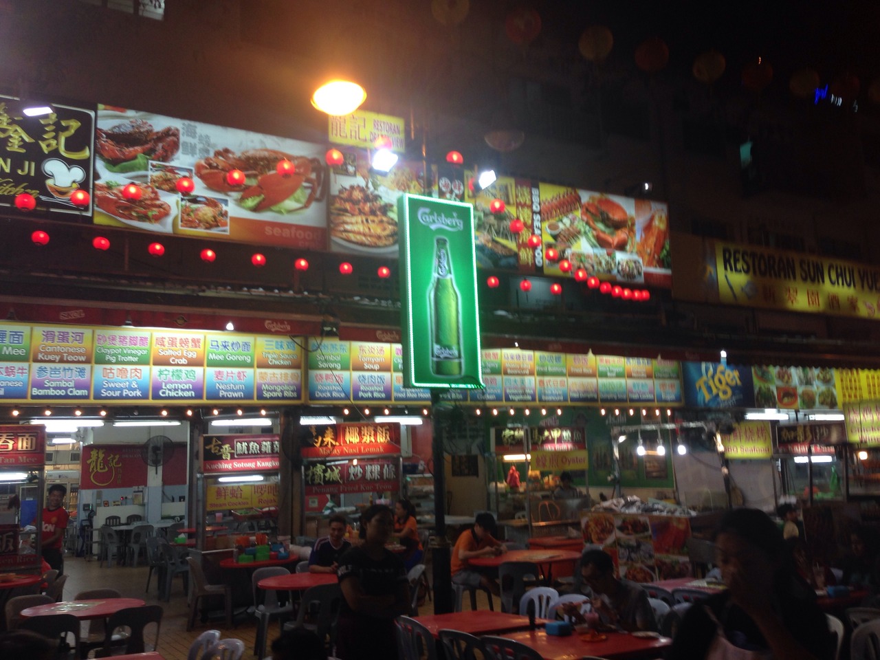 夜遅くまで賑やかな屋台ストリートです。通りの入口のお店よりも、奥の方でお客さんの多い店の方が、当たりかも知れません。魚介、油たっぷりの中華を、皆さんテーブルいっぱいに食べています。正直衛生的には見えませんが‥。