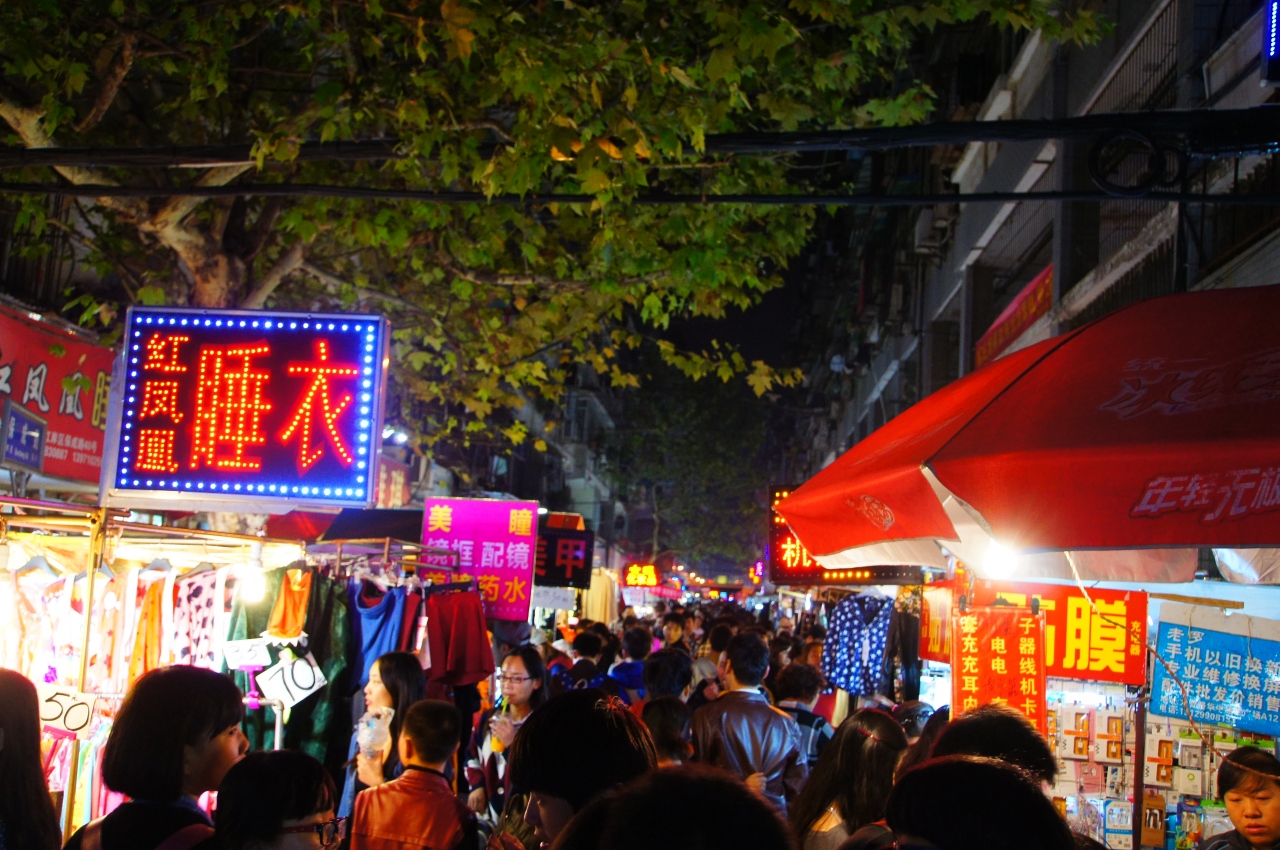 武漢に夕方到着して漢口駅から地下鉄でアクセス。工事中の道があり、混雑しています。上海の南京路に似ています。洋服屋ばかり並んでいますが、奥へ進むと屋台街が現れます。武漢の麺やB級グルメを楽しめます。裏通りの雑貨の屋台街も大混雑です。