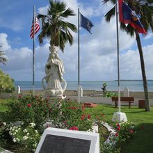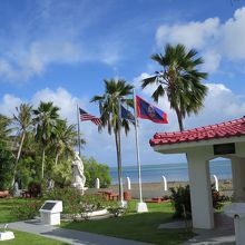 グアム南部をレンタカーを借りて一周したときに立ち寄りました。ココス島に渡る船着き場を南に過ぎた先にあり、「レディ・カマリン」と呼ばれる長い髪の白いマリア像、星条旗、グアム旗、その後ろにココス島を望むことができる綺麗な小さな公園です。公園には南国の花が植えられ、とても良い雰囲気です。レンタカーじゃないと来られないですね。