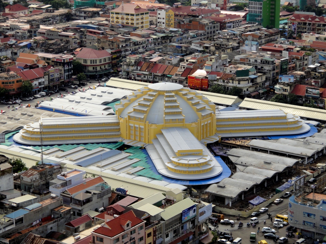 プノンペン市内でも建築物としての存在感は超一級です。黄色い外観に不思議な建築物。周囲の町並みとは懸け離れた存在に期待が高まります。しかし内部はごくありふれた街の市場であり、貴金属製品なども扱っていていささか拍子抜けしました。天窓から外光が入って内部は思いのほか明るかったです。