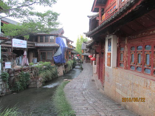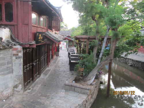観光化され過ぎた麗江古城の歴史を感じる為、早朝の五一街へ行きました。観光化され過ぎた麗江古城の中、変わらぬ悠久の流れを見ました。四方街から右側に斜め上(北東)に伸びているのが五一街。五一街は幾本物水路を横切って行きます。七一街と同じ両側にお土産物屋が並ぶ石畳の路です。七一街と同じ様に水路に沿った道で、フードコートもあります。悪く言えば似たような道で特色は有りません。水路ならではの見どころは大石橋と小石橋です。麗江玉竜雪山氷河が融けて生じた玉河泉水が古城に入ってから、2本に分かれ、4本に分かれ、更に8本に分かれて古城全域を潤しています。各家々を巡り流れる水路にはたくさんの石橋がかかり、明、清代のアーチ橋も多く保存されている。数百年の風雨によって浸食されたり、度重なる戦禍や大地震で破壊したものもあるが、今なお石橋は麗江古城の景観の一部をなしています。