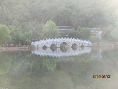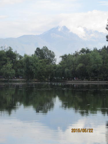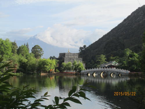黒龍潭公園の一番の見どころは黒龍潭の水面に映った山容とともに眺める玉龍雪山は絶景といわれています。玉龍雪山が良く見える午前中が勝負です。生憎山頂近くに雲が発生していましたが、山容を見る事が出来ました。黒龍潭と玉龍雪山と五孔橋と得月楼と揃ったのですが得月楼が工事中でした。まあ、これで我慢しましょう。中国の雲南省西北部、麗江市の旧市街、麗江古城の北2kmの象山の麓にある公園。「黒龍潭公園」とも呼ばれています。黒龍潭は、麗江の北にそびえる玉龍雪山(主峰の標高は5596m)の雪が溶けて染み込んだ伏流水が作り出した、周囲4kmの巨大な泉で、この泉を中心に公園となっています。この水が水路を通して麗江古城全体を潤しています。麗江古城内には幾条にも別れた水路が古城内に隈なく流れて行きます。黒龍潭のほとりには、明代に建設された高さ20mの五鳳楼(法雲閣)をはじめ、得月楼、光碧楼、龍神閣、戯堂、一文亭など建っています。雲南省北部の少数民族・ナシ族特有の東巴(トンパ)文字や文化を研究する雲南省社会科学院麗江東巴文化研究所があり、東巴文字の経典を見学できる事になっていましたが現在は閉館していました。観光化され過ぎた麗江古城にくらべ自然豊かで、風光明媚、歴史も感じられる黒龍潭です。