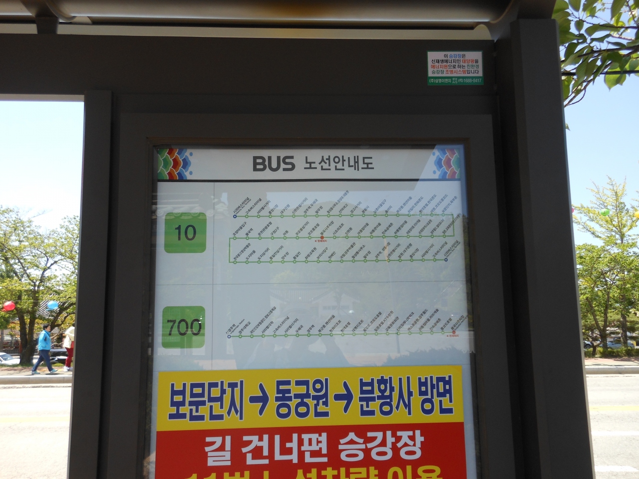 慶州高速バスターミナルまたは市外バスターミナルからすぐ近くの停留所から仏国寺へ行ける10番11番バスです。