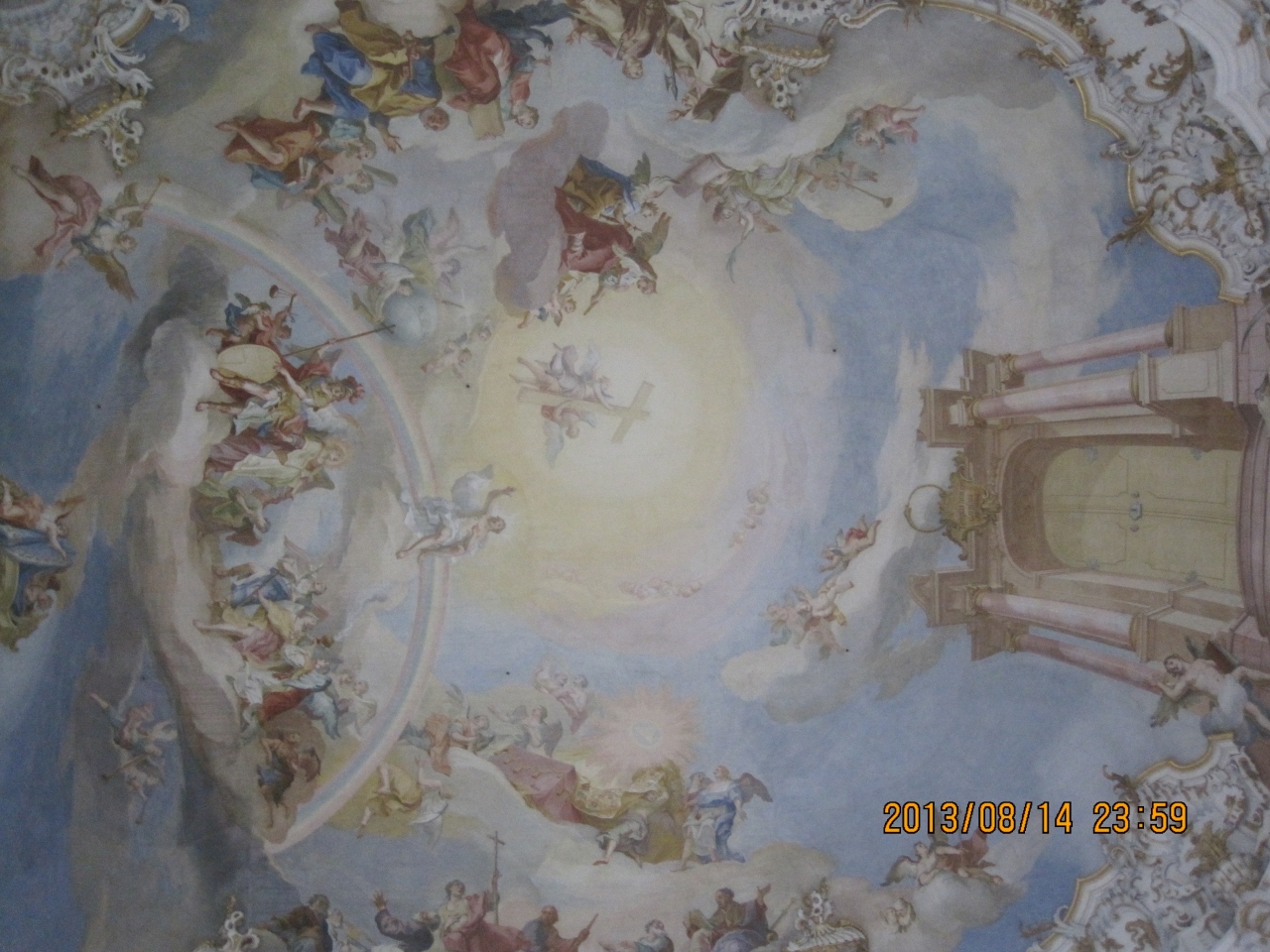 天井画が見事です。一見天井がドームの様に見えます。丸くこを描いてるようにみえますが、実際は平面とのこと。描いている絵がそう見せているようです。回りは牧草地帯で、ポツンと建っているようなところですが、今までみたどの天井画よりも感動を覚えました。