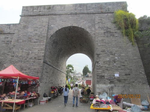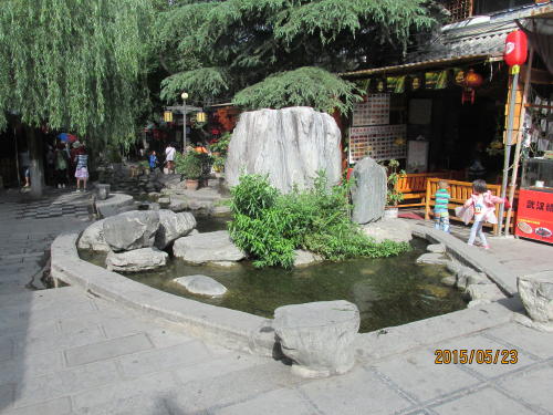 大理古城の西側に南門から続く城壁が残っています。その城壁が途切れる所に紅龍井門があり、そこから流れ出る水路を紅龍井と呼んでいるようです。蒼山から流れる透き通る雪解け水は古城の水路を通り、(シ耳)海に流れ注ぎます。水路は紅龍井門から東へ城内を流れています。新しく観光用に整備された水路のようで、遊歩道が整備され、水路の両側に柳の並木が続き、飲食店も並んでいます。特に博愛路の交差点から復興路までは両側にベンチが並べられ、飲食店も密集しています。特に夜の成るとバー街になり、一段と賑やかさが増すようです。