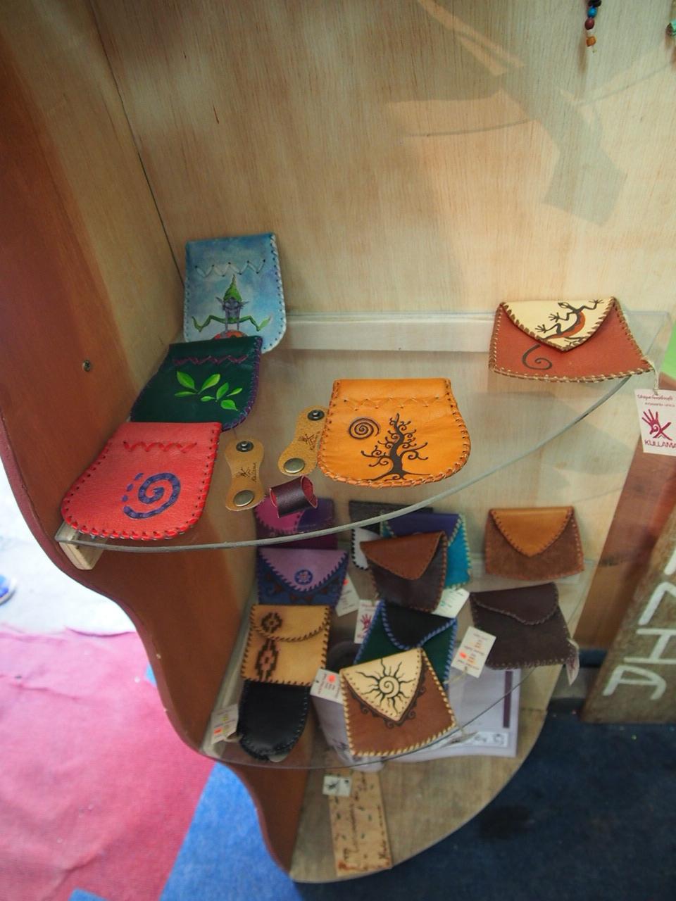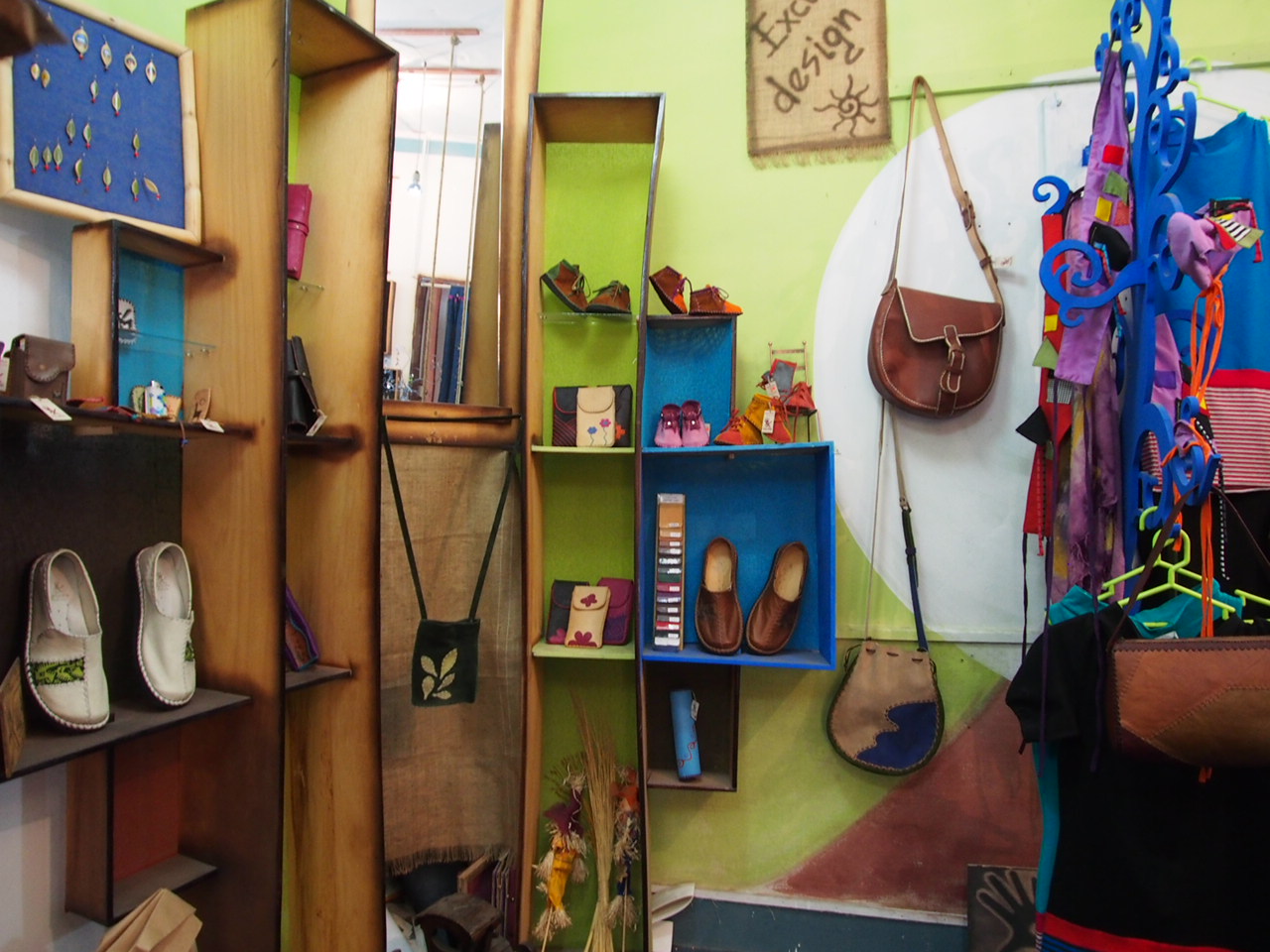 リャマの革を使ったバッグ、財布、巾着袋等 デザインセンスの良いお土産が並べられています。