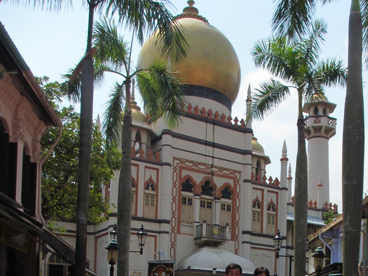 アラブストリート近くにある、シンガポール最大の金色をしたモスク(イスラム教徒の教会)です。敬虔なる教徒の人たちがやってきては、お祈りをささげています。観光客も金曜日の午前中を除いて入ることはできますが、肌を出していると入館を断られます。その場合は、モスク内にある上着を借りることができます。