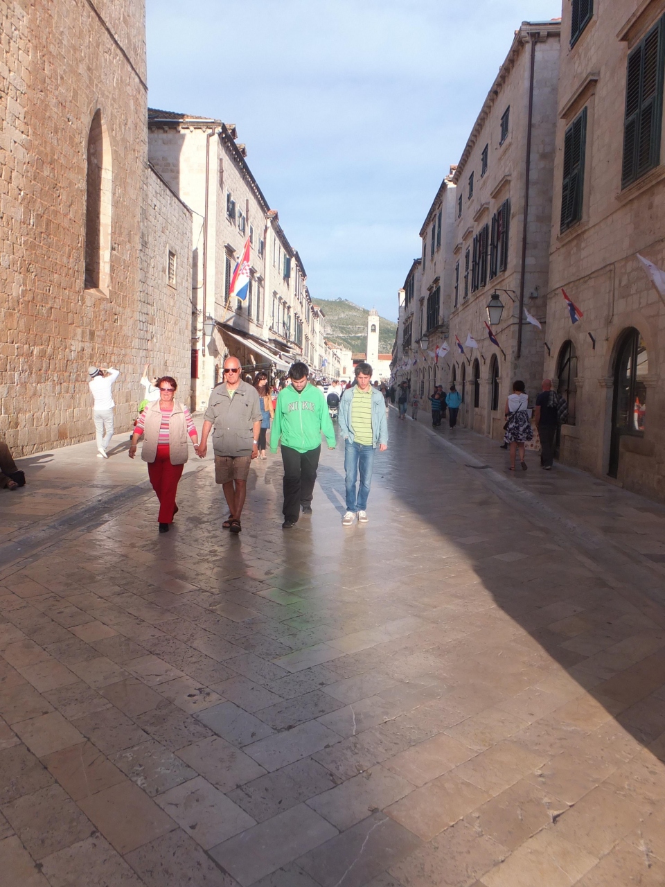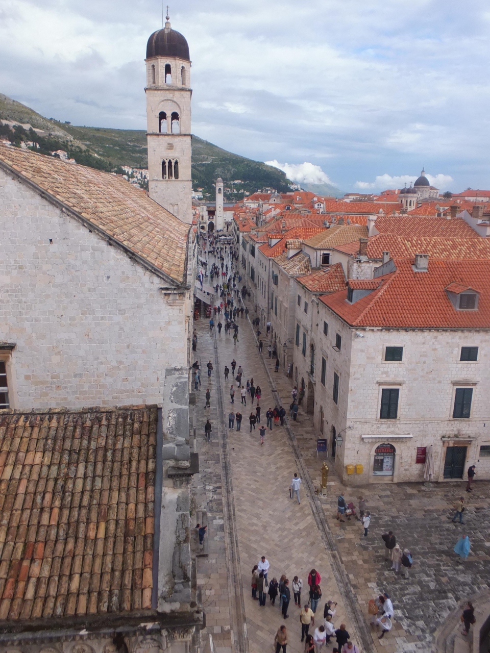 ドブロヴニクの市街は、ピレ門から旧提督邸に至るこのプラツァ通りと、その周りに縦横に広がる細い道で構成されています。プラツァ通りに沿っては、お土産屋さんやレストランが並んでいます。昼も夜も楽しく歩ける通りです。