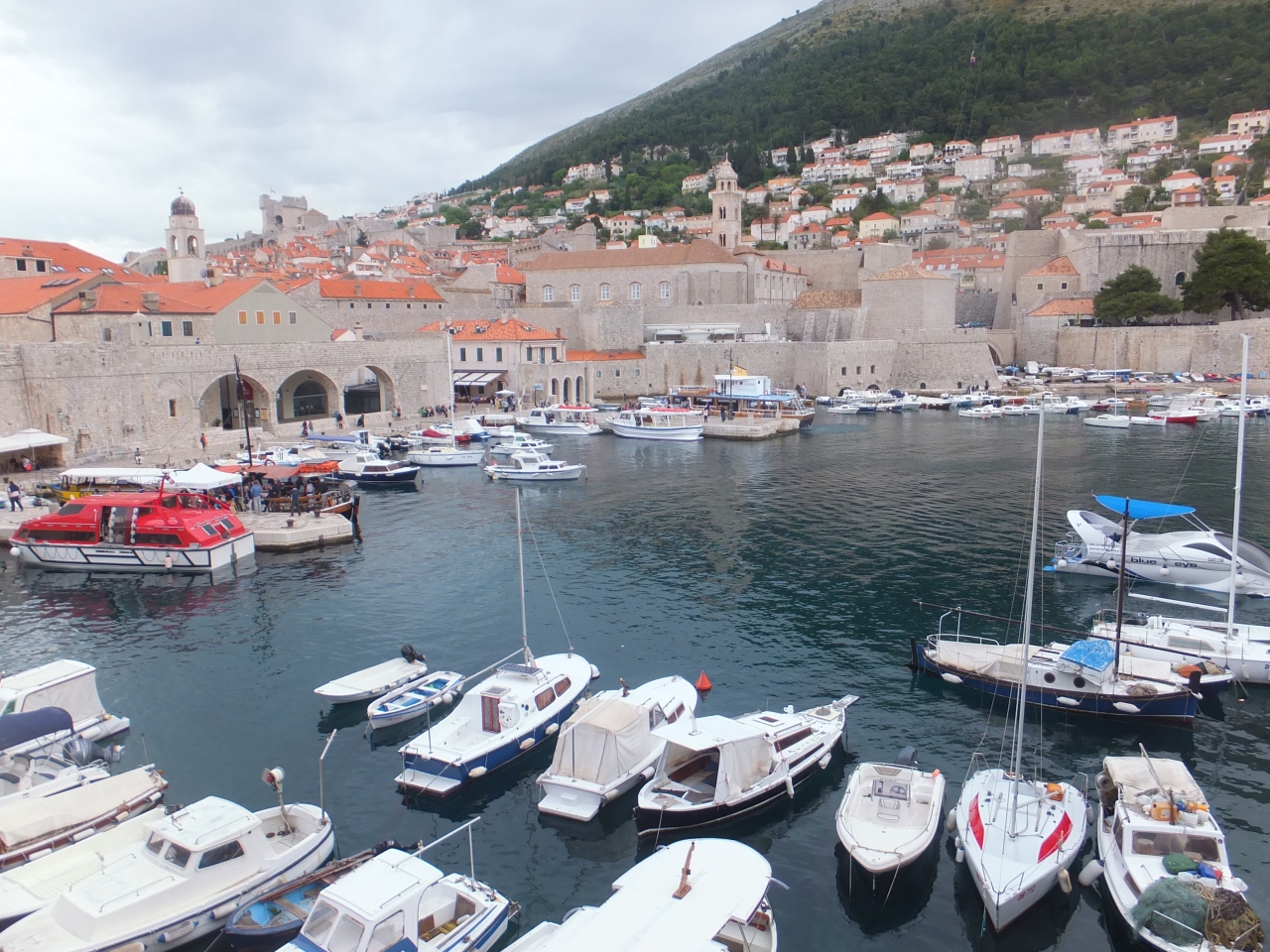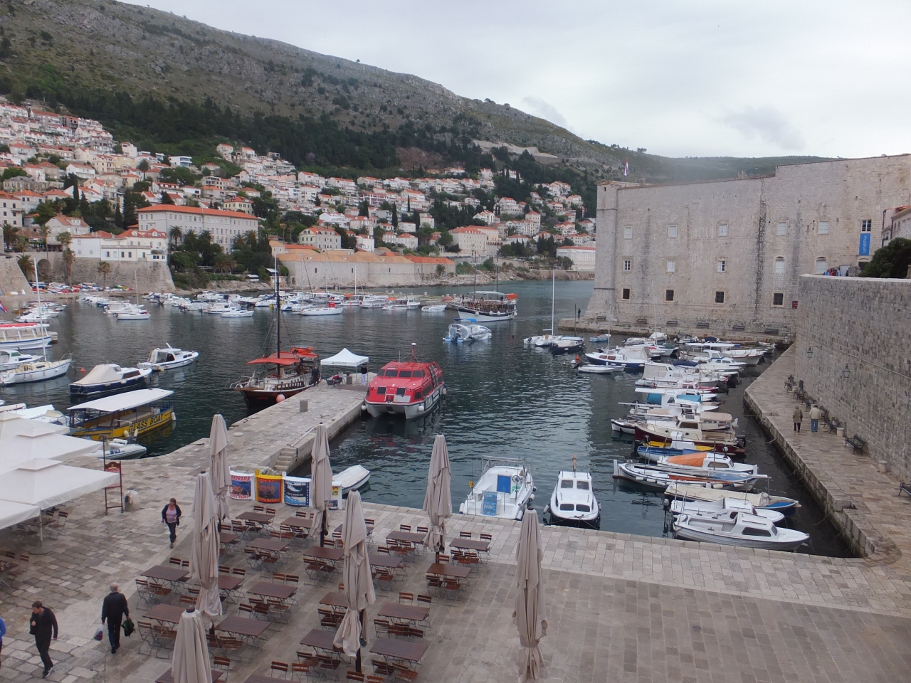 ドブロヴニクの旧港は、遠くから見ても、近くに寄って見ても、趣のある港です。旧市街は城壁に囲まれていますが、城壁の上からは至近で港の全景が見えます。スルジ山ロープウェイに乗れば、旧市街の美しさに花を添える港です。湾岸はにぎやかで、歩いて楽しいところでもあります。