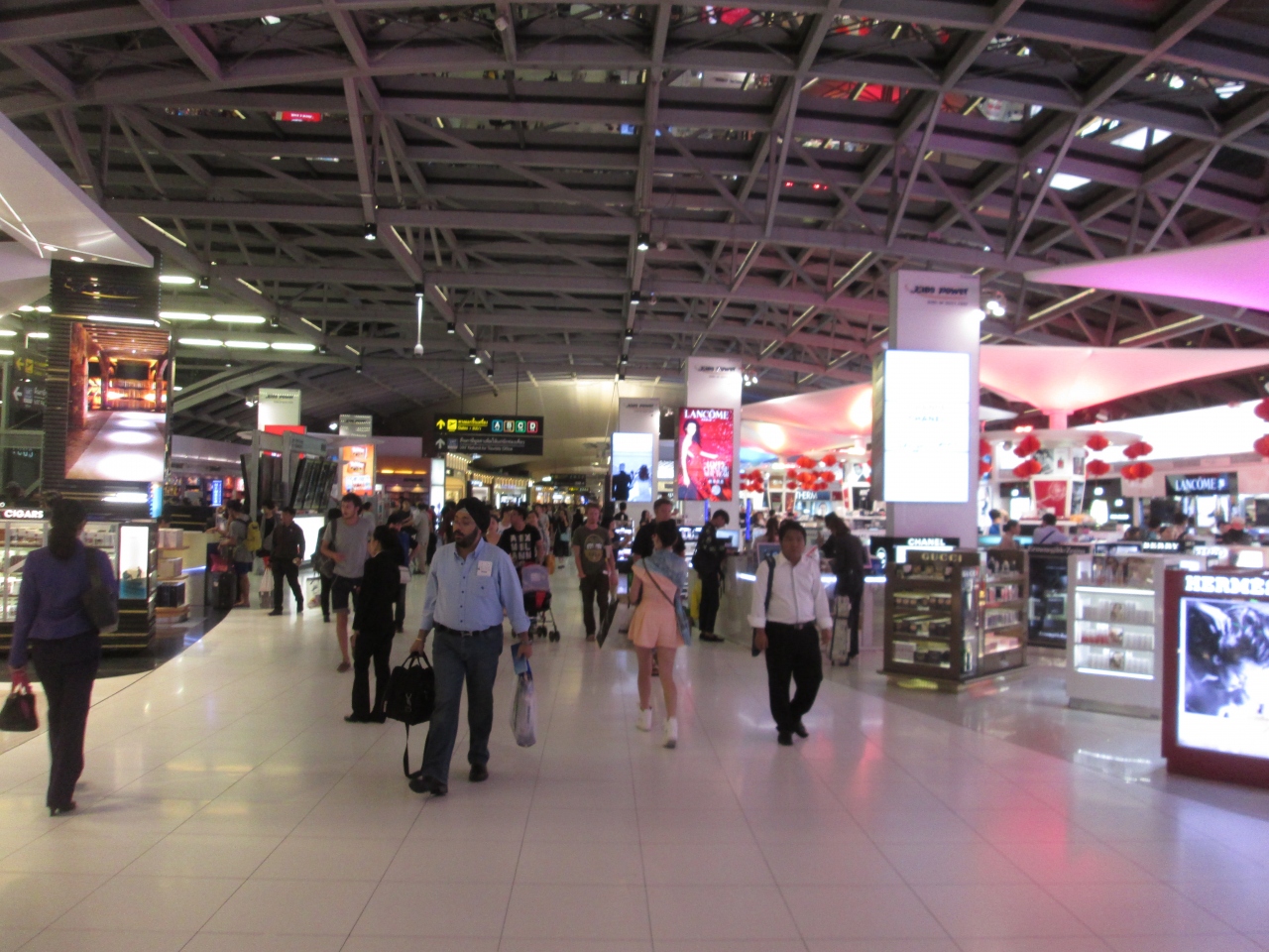 スワンナプーム空港内の免税店は種類豊富で充実しています。ブランド物、コスメからばらまき用のお土産が買えます。特に、チョコレートやココナッツ菓子などは、試食できるので味を確かめてから購入でき、お土産選びに失敗がありません。