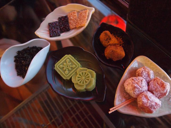 お茶が運ばれてくると、最初に店員がお茶の作法を見せてくれます。それが終わると飲み方を教えてくれました。お茶菓子は甘い梅やゴマのお煎餅など、4~5種類出てきました。お茶はとてもいい香りでまろやかで飲みやすかったです。急須のお湯が無くなれば足してくれ、使わなかった茶葉は持ち帰り用の袋に入れてくれました。お茶とお茶菓子のセットで300元でした。上の階の窓際の席に案内されたので、九份の絶景や雰囲気を堪能しながらお茶を楽しむことができ、大満足でした。