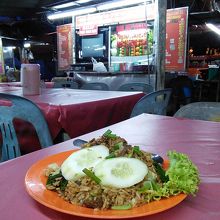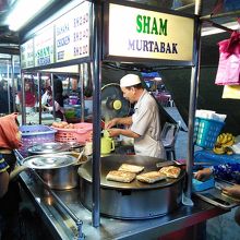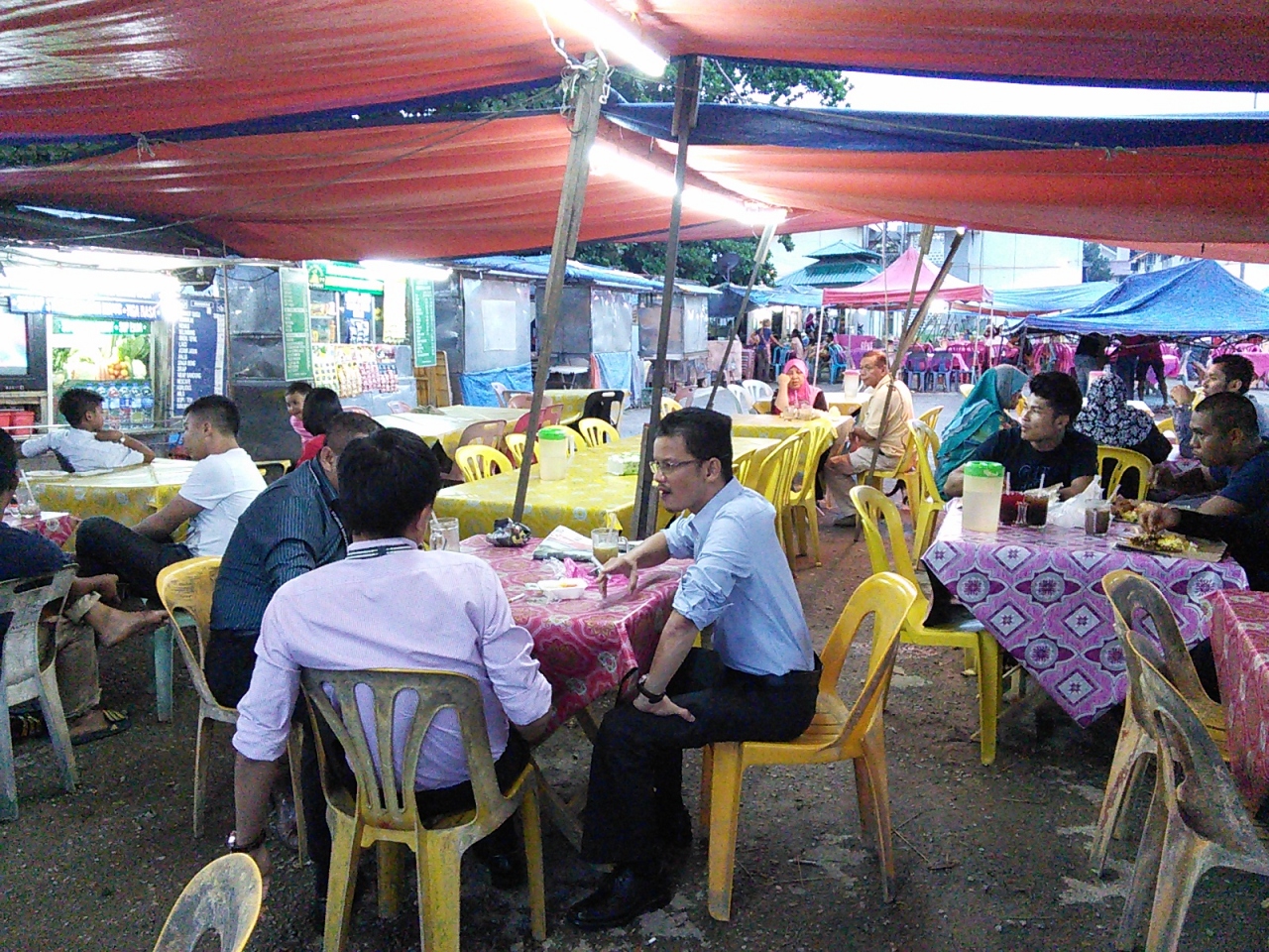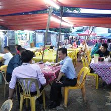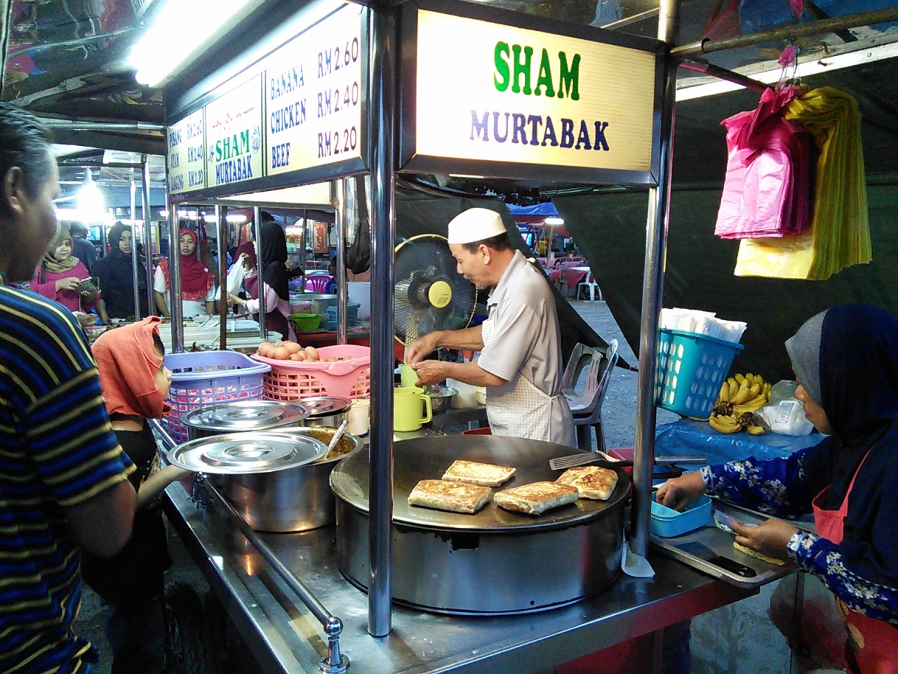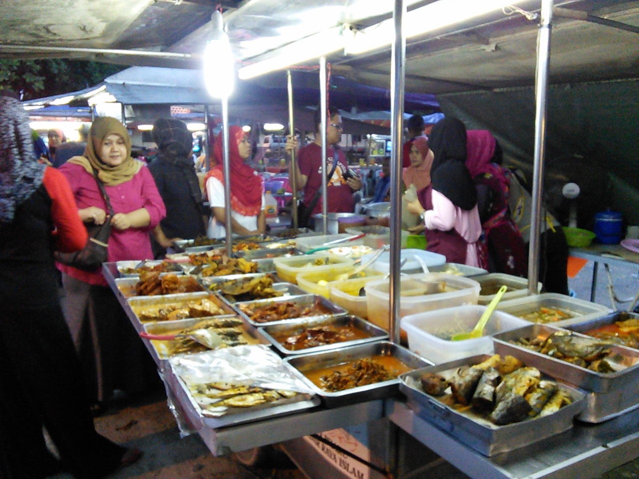 バスターミナルの東側のJalan MaahadとJalan Pintu Pongの交差点からちょっと寂しい道路を北へ100mほど進んだ左手にあります。屋台が20~30軒ほど出ています。左手にはナシゴレンやミーゴレンなど(4RM~)の炒め物系や麺類やスープの店が並んでおりテーブルとイスが出してあります。他の店で買ったものもこのテーブルで食べることができます。飲み物を注文するという条件かもしれませんが注文しなくても大丈夫だと思います。ナシブンクス(紙などに包んでくれるぶっかけ飯)をテイクアウトして食べている人もいますがマレーシア人は皆、手で食べています。手で食べるのが嫌な人はスプーン、フォークなどを持参した方がいいかもしれません(お願いすれば飲み物を注文した店で貸してくれるかもしれませんが…)。あとティッシュペーパーも持っていった方がいいと思います。テーブルに乗っている水差しは手洗い用で飲むためのものではありませんのでご注意を。