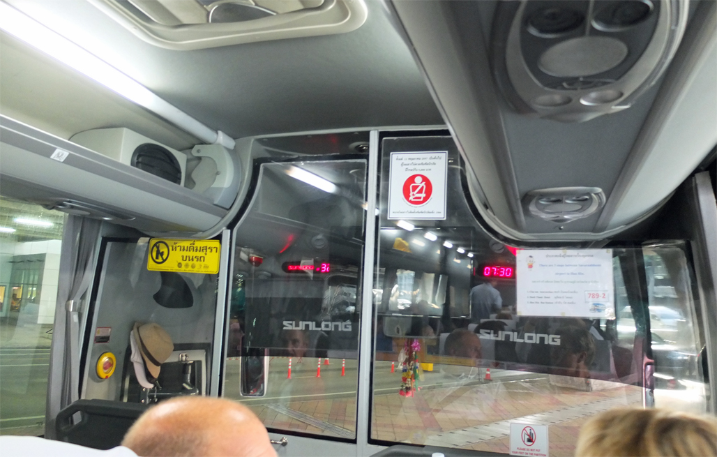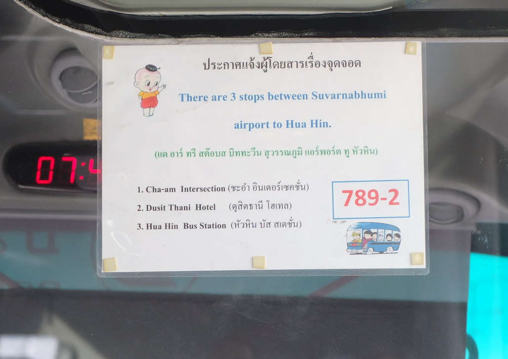 バスは結構新しくきれいです、1列プラス2列の24席でゆったり座れます、運転席と客席は透明のパーティションで仕切られています、最後部にはトイレがあるので途中のトイレ休憩はありません、チケットはネットで事前購入(座席指定もできます)するかデュシタニ ホアヒン経由の予約もできますがどちらもやはり便の変更やキャンセルの場合払い戻しはないので確定してからの予約かターミナル1階8番ゲート横にあるPattaya / HuaHinカウンターで当日購入の方がよさそうです、でも各便24席しかないのでどうしてもその時間の便に乗りたい場合や希望の座席がある場合等は事前購入でしょうか、運賃は2名で587バーツでした。ちなみに今回利用した7:30発の便は座席は2/3程度埋まっていました。バスは途中チャアムのバンコク銀行前の交差点、次にデュシタニ ホアヒンホテルに停車します、デュシタニ ホアヒンは4号線から長いアプローチを入ってエントランスまで行ってくれるので荷物を運ぶ手間もなく大変便利です、所要時間はちょうど3時間でした、この後バスはホアヒン駅から2?程南のソイ96/1にあるホアヒンバス停まで行くようです。ちなみに、Dusit Thani BangkokとDusit Thani Huahin間であればDusit Sprinterが1日1往復しており一人660バーツで利用できます。