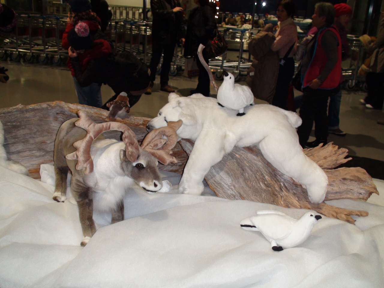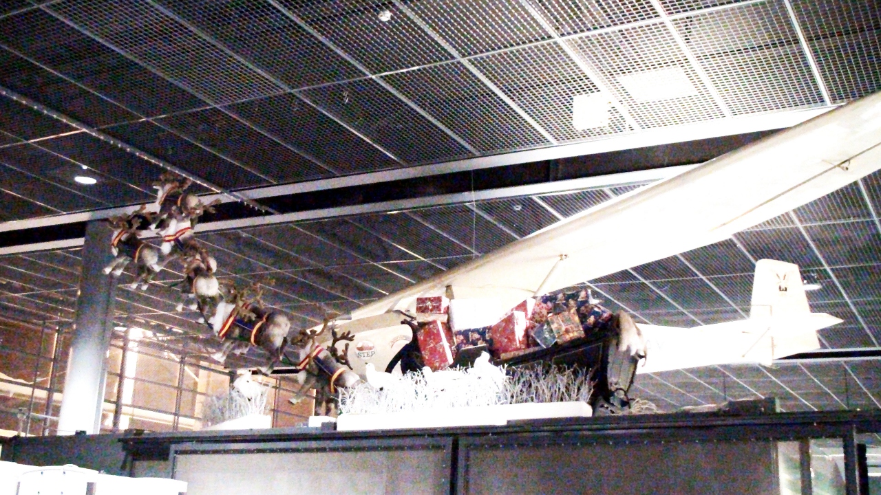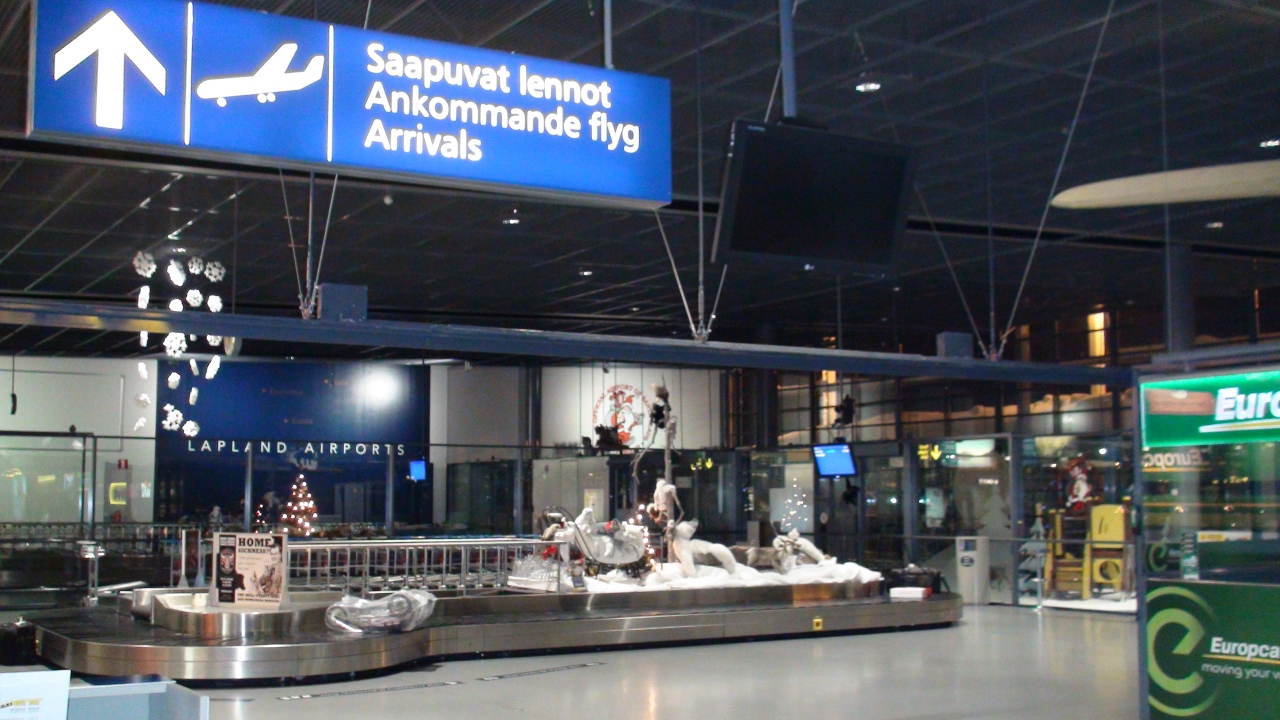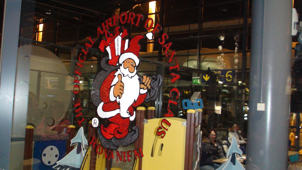 ヘルシンキから1時間20分で到着する。ローカル空港だけど設備は良く揃っている。便数が少ないだけ、施設職員も少なくのんびりしている。飛行機が到着すると関係者は準備に取り掛かっている。空港内はサンタクロースのデザインが趣向を凝らして飾ってある。北極圏の空港だけに、其の案内もある。