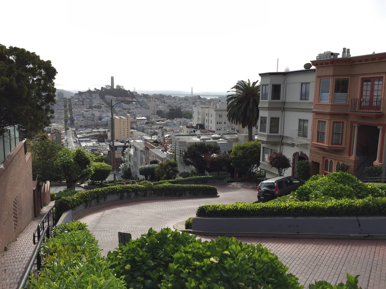 フィッシャーマンズワーフからケーブルカーで途中下車し、上から下に下りました。坂の上からは、コイトタワーやベイブリッジが見渡せます。